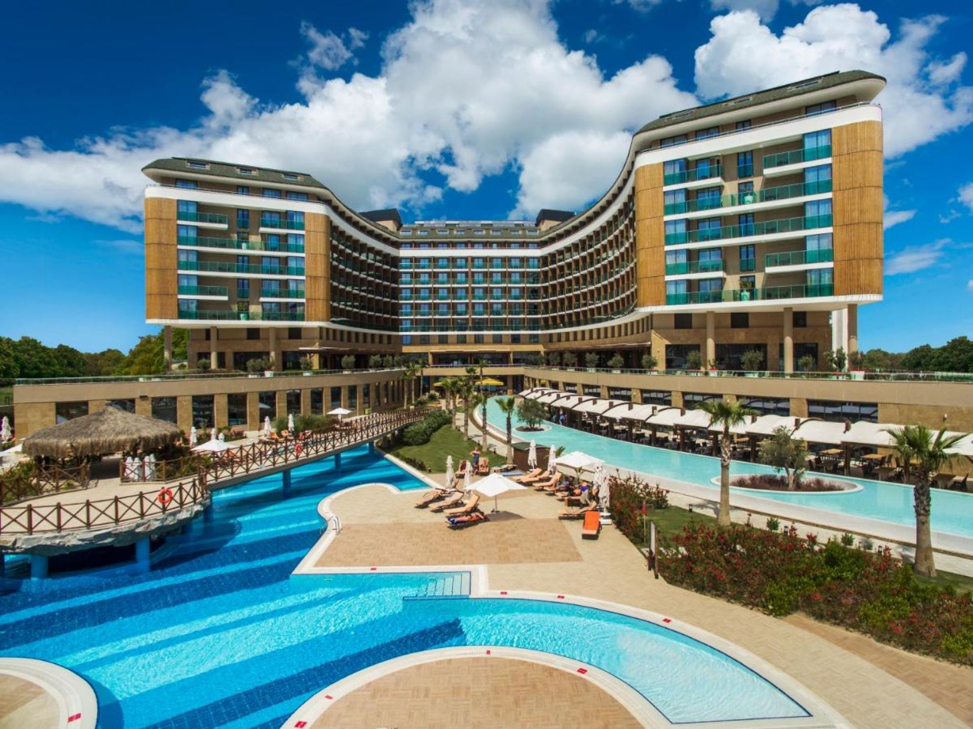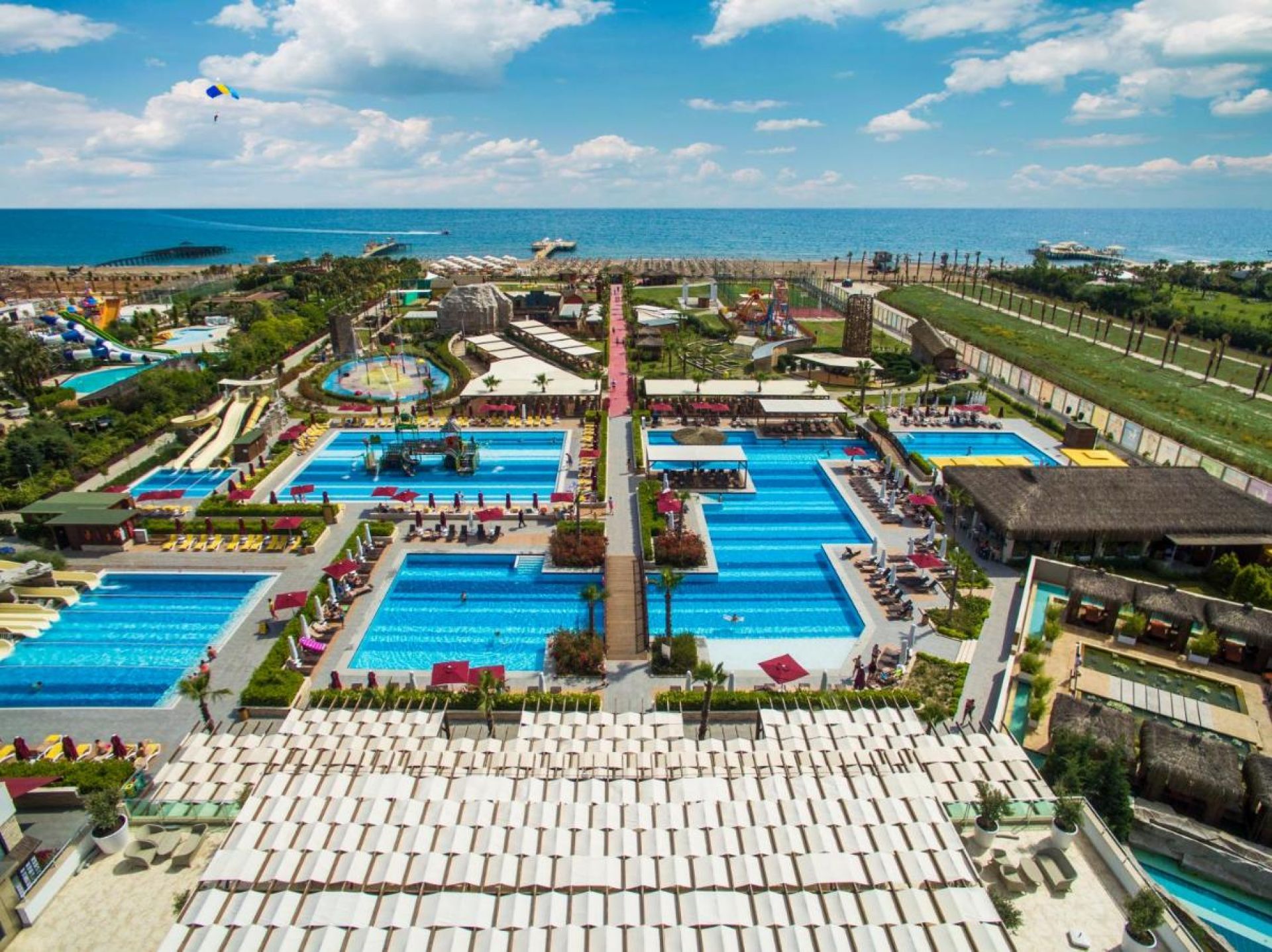 Основен ресторант, 6 а-ла-карт ресторанта (италиански, азиатски, рибен, турски, стек хаус – срещу заплащане; бистро с интернационална кухня - 1 безплатно посещение на 1 от ресторантите при минимум 7 нощувки, с предварителна резервация), 3 снек бара, сладкарница, 9 бара, 4 открити басейна (1 отопляем), 1 закрит отопляем басейн, аквапарк с 9 водни пързалки, СПА център, амфитеатър, открита дискотека, кино, магазини, 5 конферентни зали, паркинг.