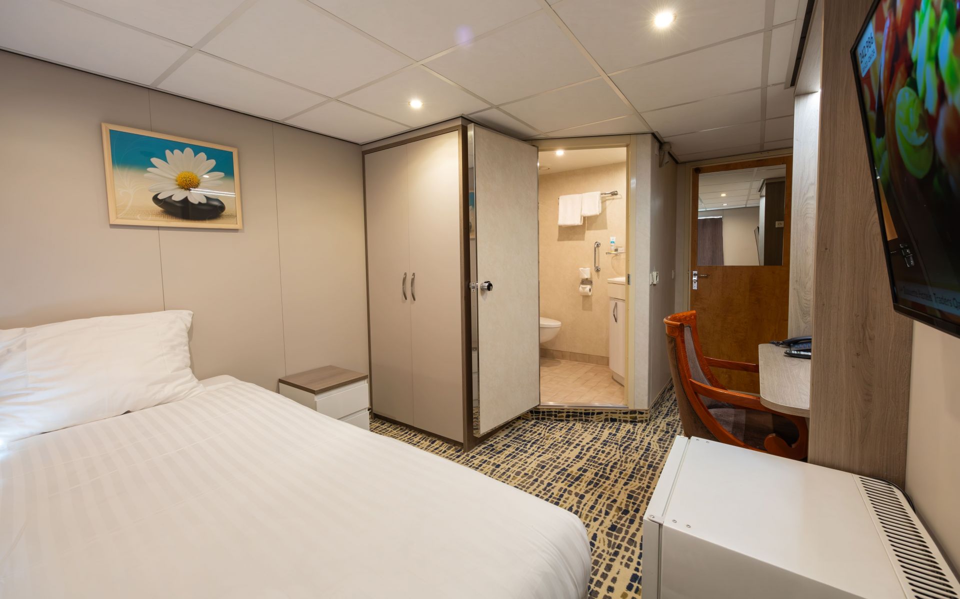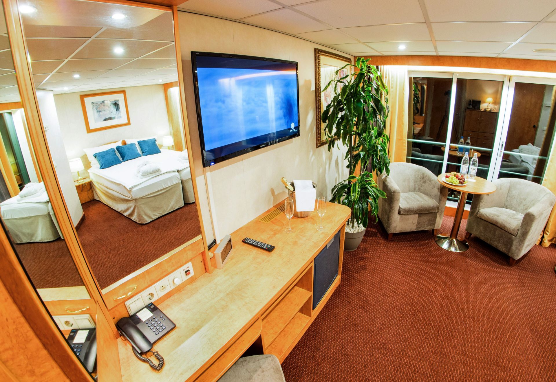 Всички каюти са с индивидуален климатик, сателитна телевизия, вътрешен телефон, мини бар, сешоар, сейф.