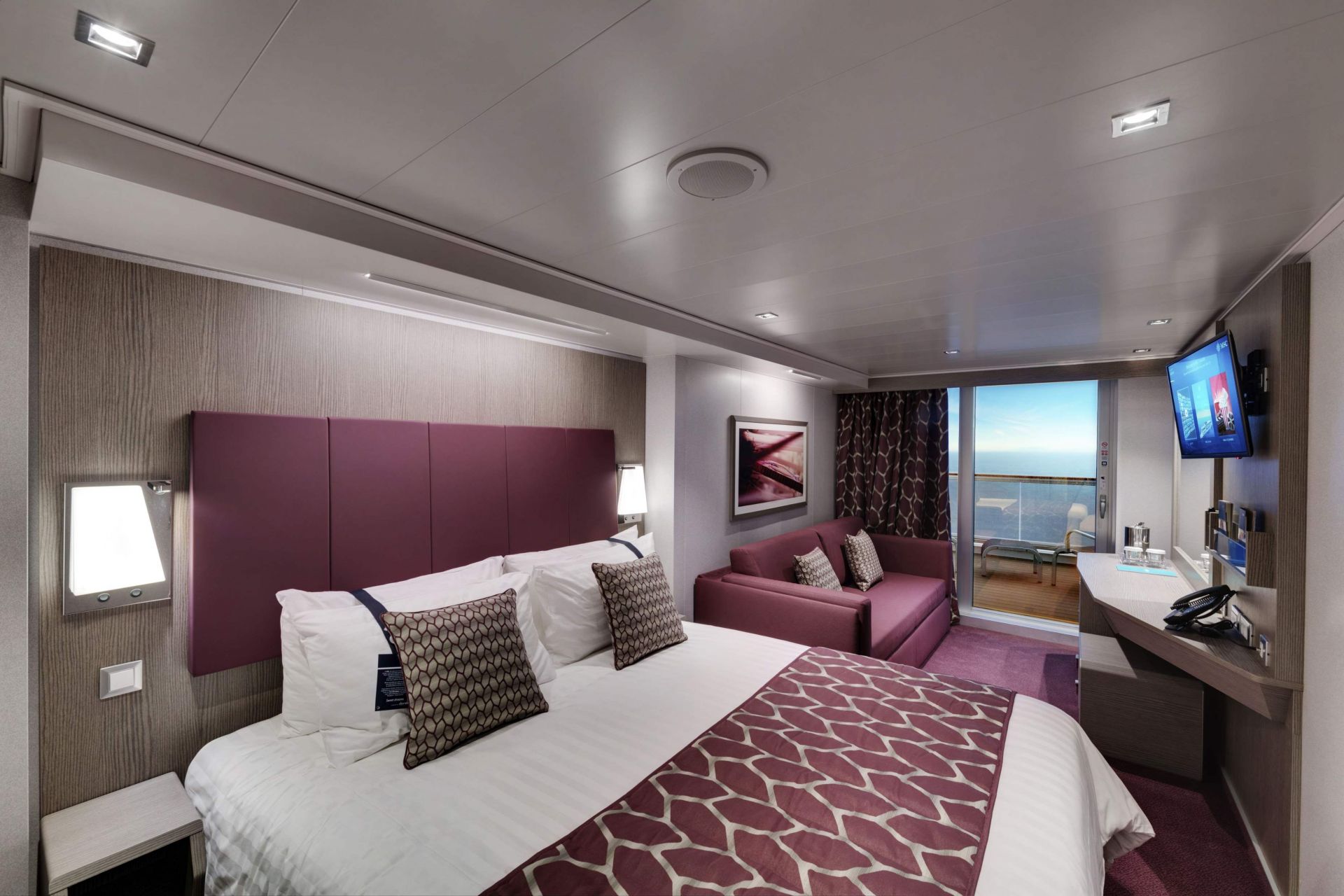 Суити с джакузи, каюти с балкон, каюти с прозорец / не се отваря /, вътрешни каюти, каюти за инвалиди. Всички с интерактивна ТВ, телефон, сейф, минибар, климатик, интернет срещу заплащане.