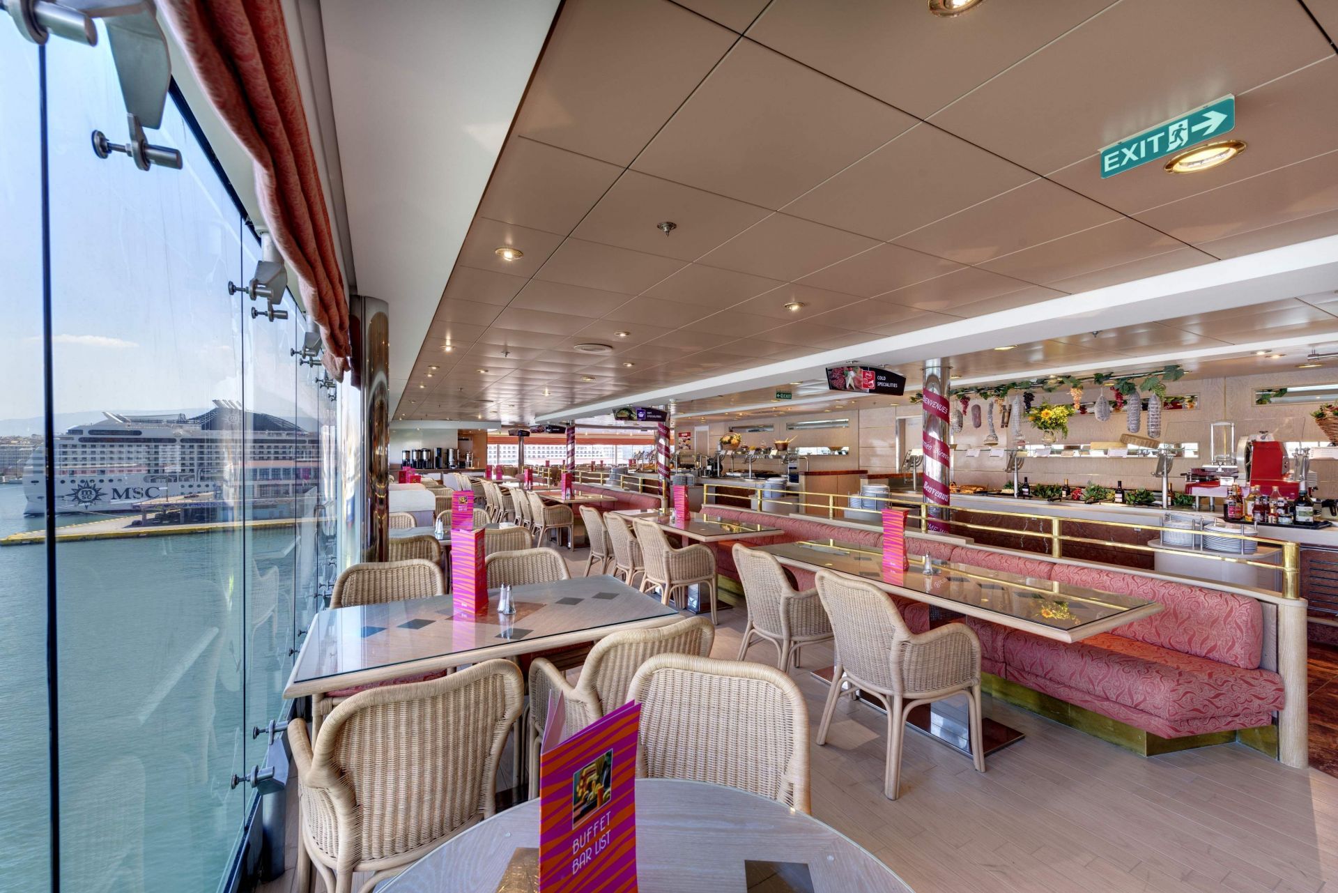 2 основни ресторанта, бюфет ресторант, пицария, суши бар, 8 тематични бара, 2 бара на откритите палуби, сладоледен бар с италиански сладолед.
