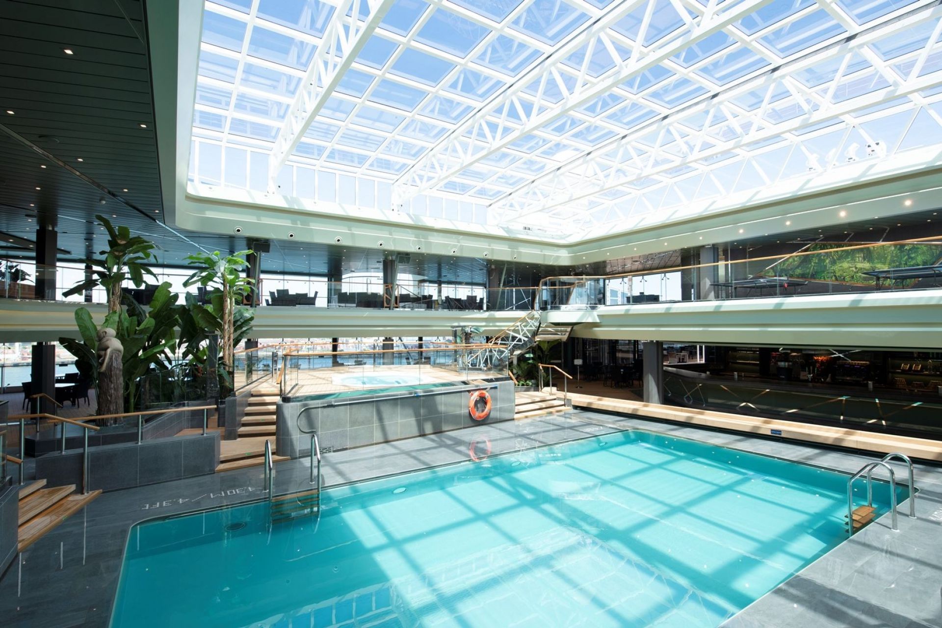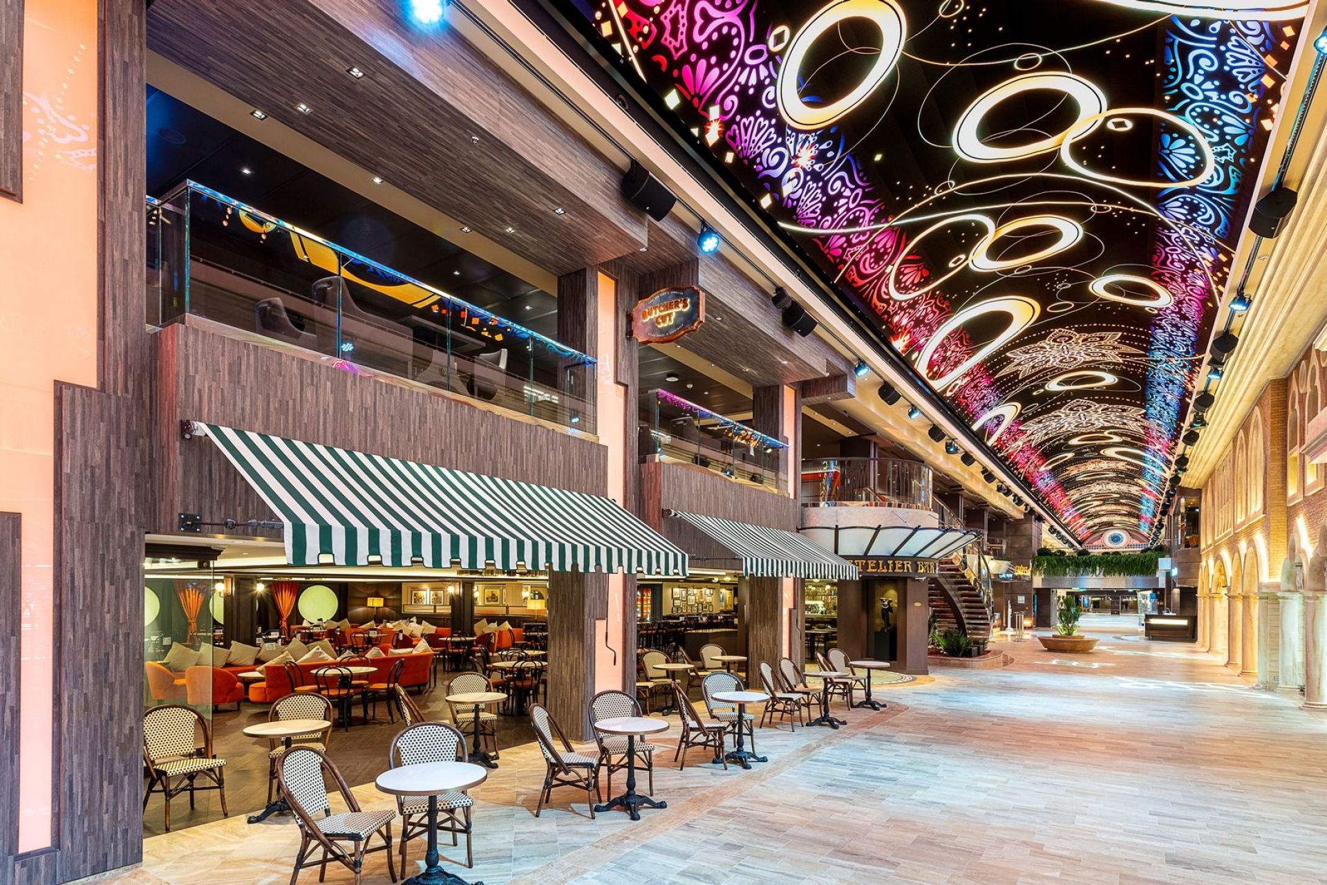 Класическата вече за корабите от флотилията вътрешна променада с LED таван, обградена от ресторанти и магазини, отново се превръща в център на социалния живот на борда, както и в сцена на различни партита и събития.