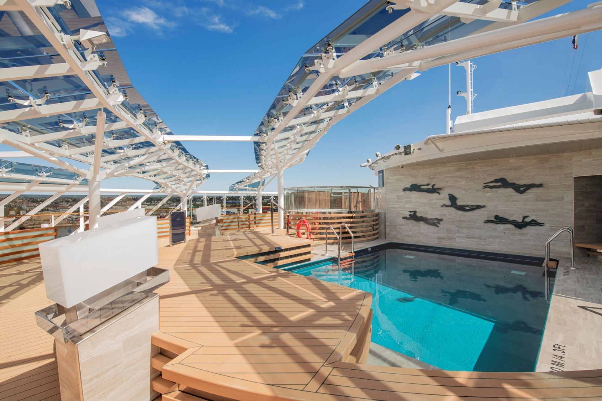5 басейна и аква парк с водни пързалки и голяма плажна зона с шезлонги около тях на откритите палуби, СПА център с масажи и козметични процедури, фитнес с уреди от Technogym, солариум, спортна зона с игрище за баскетбол, волейбол, фитнес и тенис, симулатор на Формула 1.