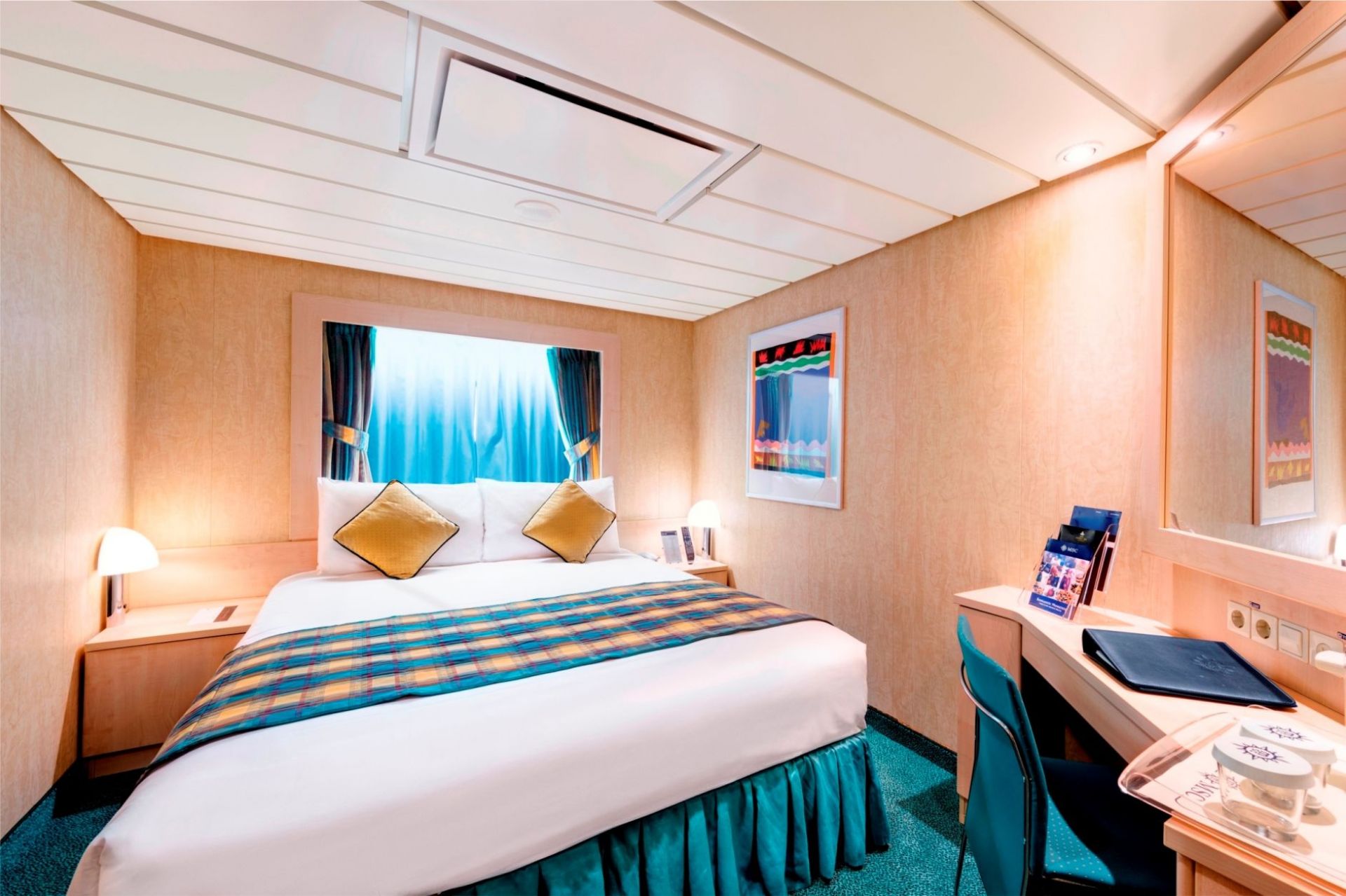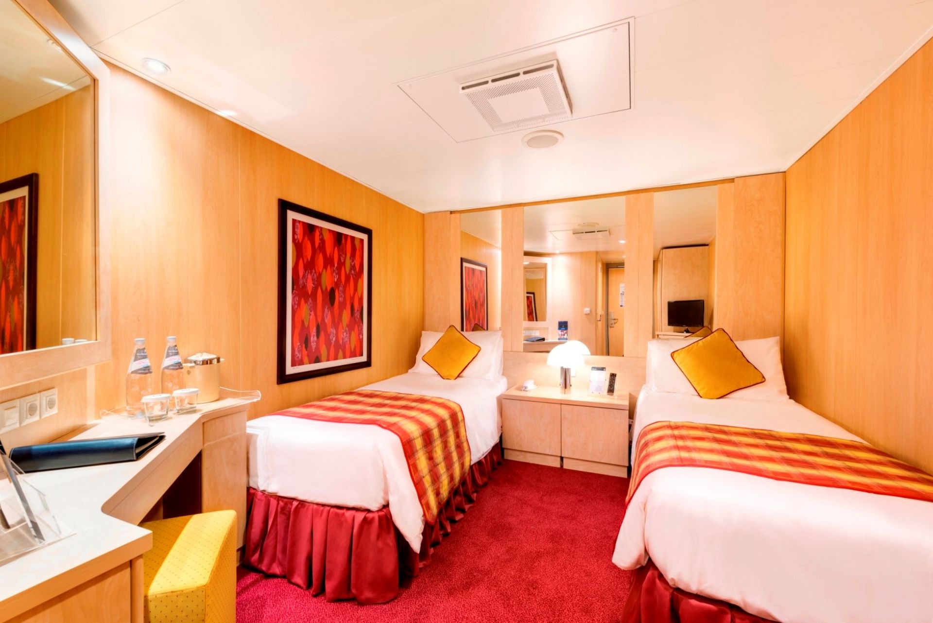 Суити, каюти с балкон, каюти с прозорец /не се отваря/, вътрешни каюти, каюти за инвалиди. Всички със сателитна ТВ, телефон, сейф, сешоар, климатик, минибар, интернет и рум сървиз срещу заплащане. Повечето разполагат с диван, който се превръща в трето легло или 2 легла една над друго за настаняване на 2 деца.