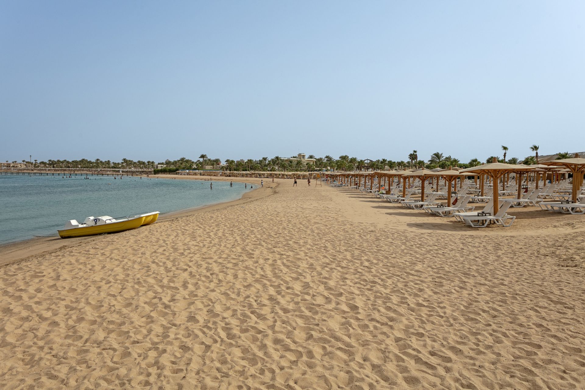 Собствен, пясъчен. Чадъри, шезлонги и плажни кърпи на плажа и при басейна - безплатно.
