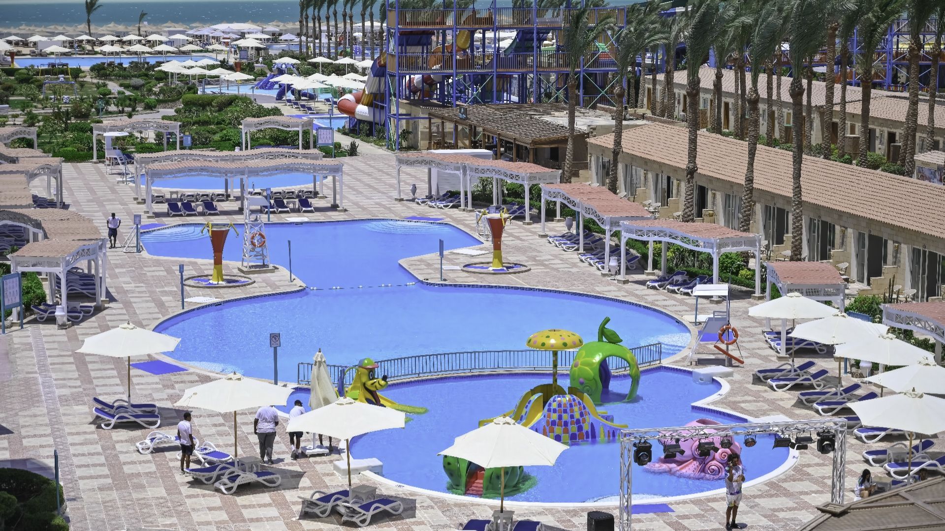 Основен ресторант, 3 а-ла-карт ресторанта (мексикански, египетски и гръцки - с предварителна резервация, съгласно концепцията на хотела), 6 бара, 3 открити басейна (1 отопляем през зимния сезон), аквапарк с 10 пързалки, СПА център, конферентна зала, магазини.
