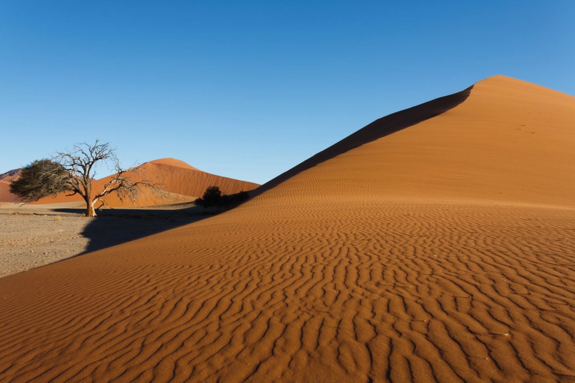 Пристигане на международното летище "Hosea Kutako" Уиндхук. Среща с местния екскурзовод и трансфер до Сосувлей с редовни спирки по пътя, за да се насладите на красивите пейзажи. Настаняване в "Namib Desert Lodge Gondwana" - комфортен лодж, разположен под впечатляващи вкаменени дюни, от където се откриват впечатляващи гледки към древната пустиня. В лоджа има два плувни басейна, които са заобиколени от пясъчното великолепие. Потопете се във величието на пустинята, докато наблюдавате красивия залез. Нощувка.Сосувлей: Разположен в най-голямата защитена зона в Африка (Национален парк Намиб-Науклуфт) и е може би най-впечатляващата и най-известната атракция в Намибия. В Сосусвлей се намират емблематичните червени пясъчни дюни на Намиб. Ясното синьо небе контрСкритвлейастира с гигантските червени пясъчни дюни, което прави това място едно от природните чудеса на Африка и рай за фотографите. Освен забележителностите в Сосусвлей - Дюна 45, Големият татко и Дедвлей - други забележителности в района включват каньона Сесрием и националния парк Намиб-Наклуфт, където планините на Намиб срещат равнините.