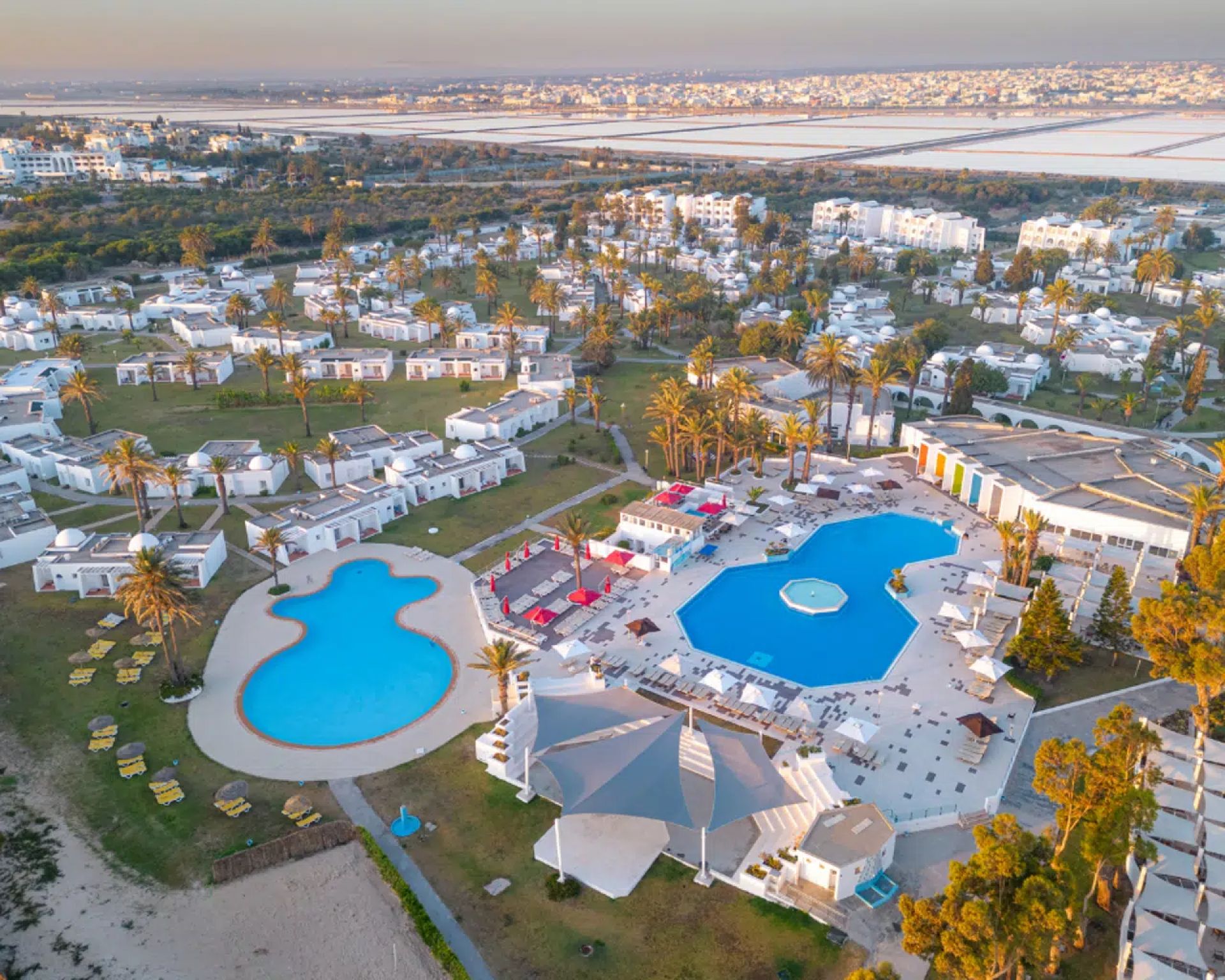 Основен ресторант с детски бюфет, снак бар Express, а ла карт ресторант със средиземноморска кухня (платен, едно безплатно помещение на престой, след предварителна заявка), а ла карт ресторант с тунизийска храна (платен, едно безплатно помещение на престой, след предварителна заявка), а ла карт ресторант с морска храна (платен, едно безплатно помещение на престой, след предварителна заявка), основен бар, бар басейн, плажен бар, аква парк бар, външен басейн, външен басейн за гости над 16+, вътрешен басейн, аква парк включващ басейн с 9 водни пързалки и "мързелива" река, 24 часова рецепция, СПА център, сувенирен магазин, 2 тенис корта.