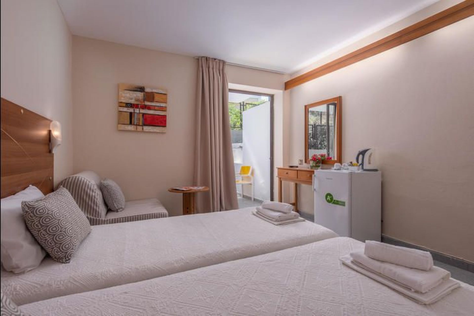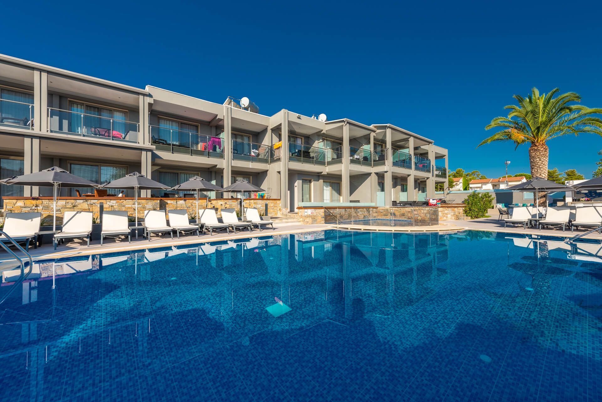 Разположение: Хотелът се намира в селището Ханиоти , на 120м от плажа и само на 50м от центъра на селището. Хотелът е изцяло реновиран.