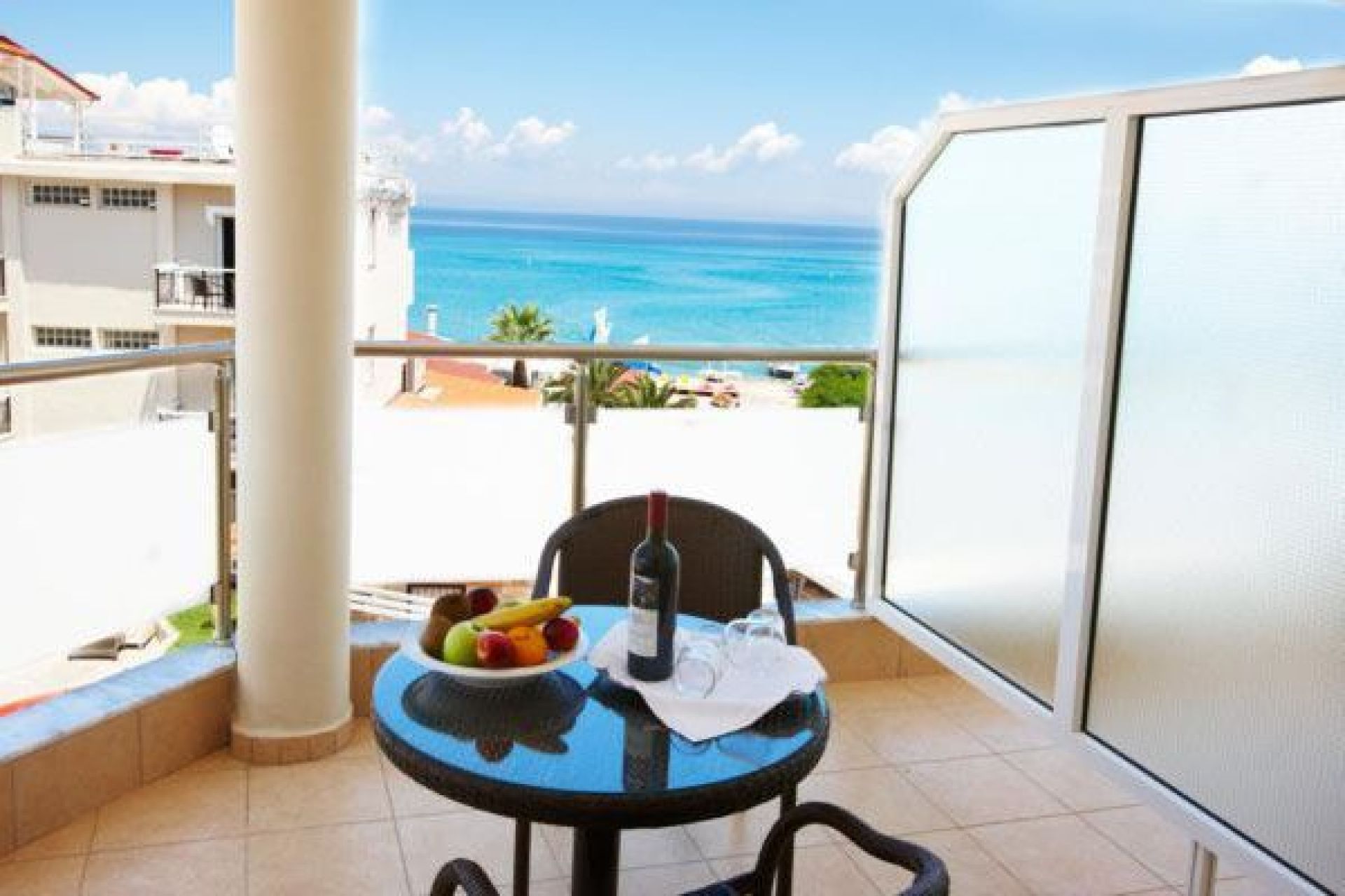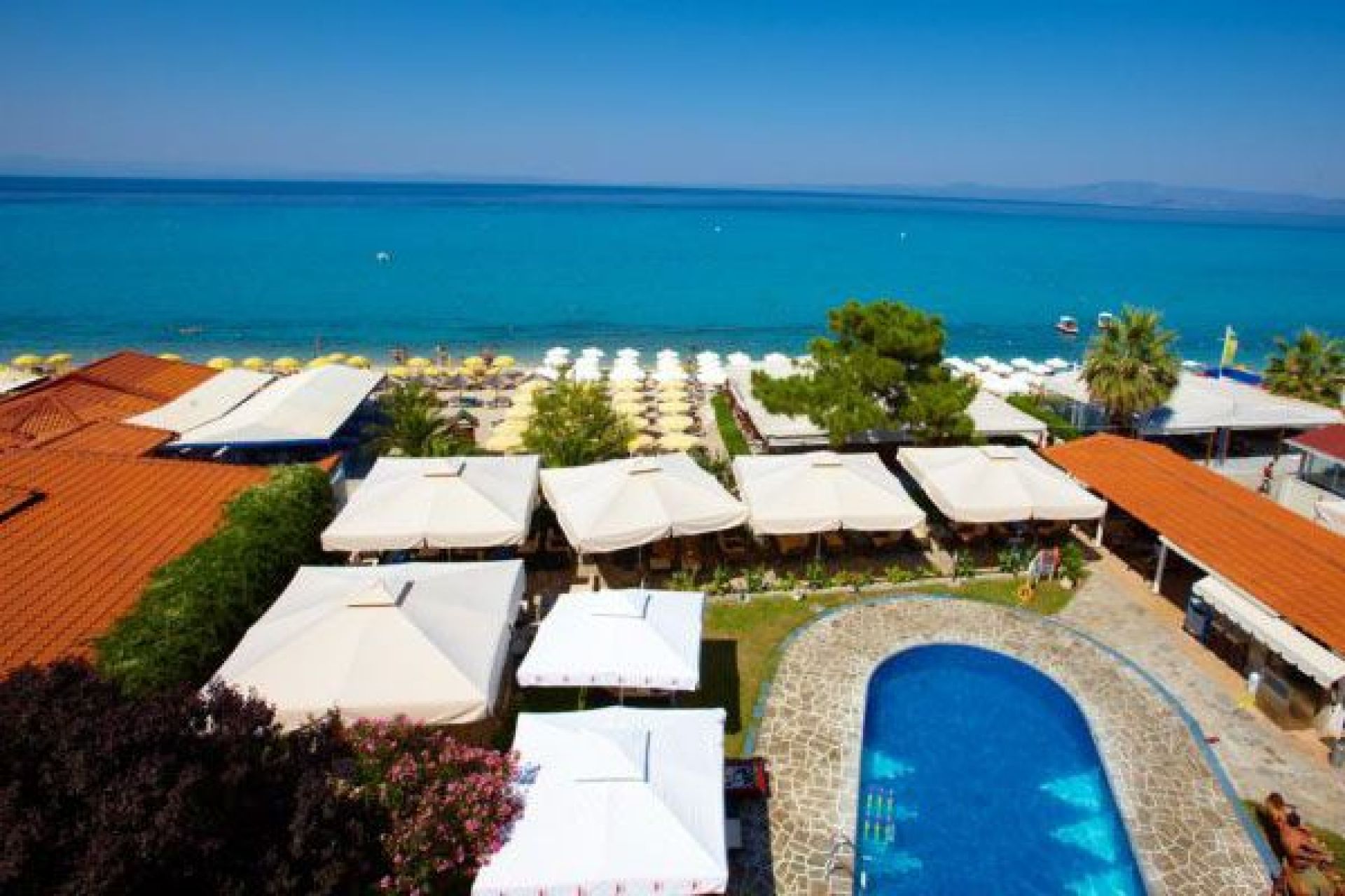 Разположение: Намира се на брега на морето в централната част на един от най-космополитните курорти на Халкидики – Ханиоти.