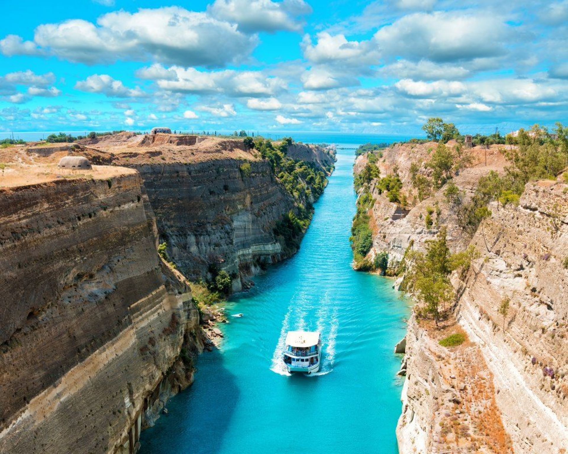 Благодарение на Коринтския канал, се спестяват 700 км. заобикаляне на п-ов Пелопонес. Започва да се строи през 1881 г. и първият кораб, който преминава през него е на 25 Юли 1893 г. Проектът е на двама унгарски архитекти, участвали в строежа на Панамския канал. Дължината му е 6343 м. и свързва Егейско с Йонийско море. Тук се прави спирка за кафе и фото пауза.