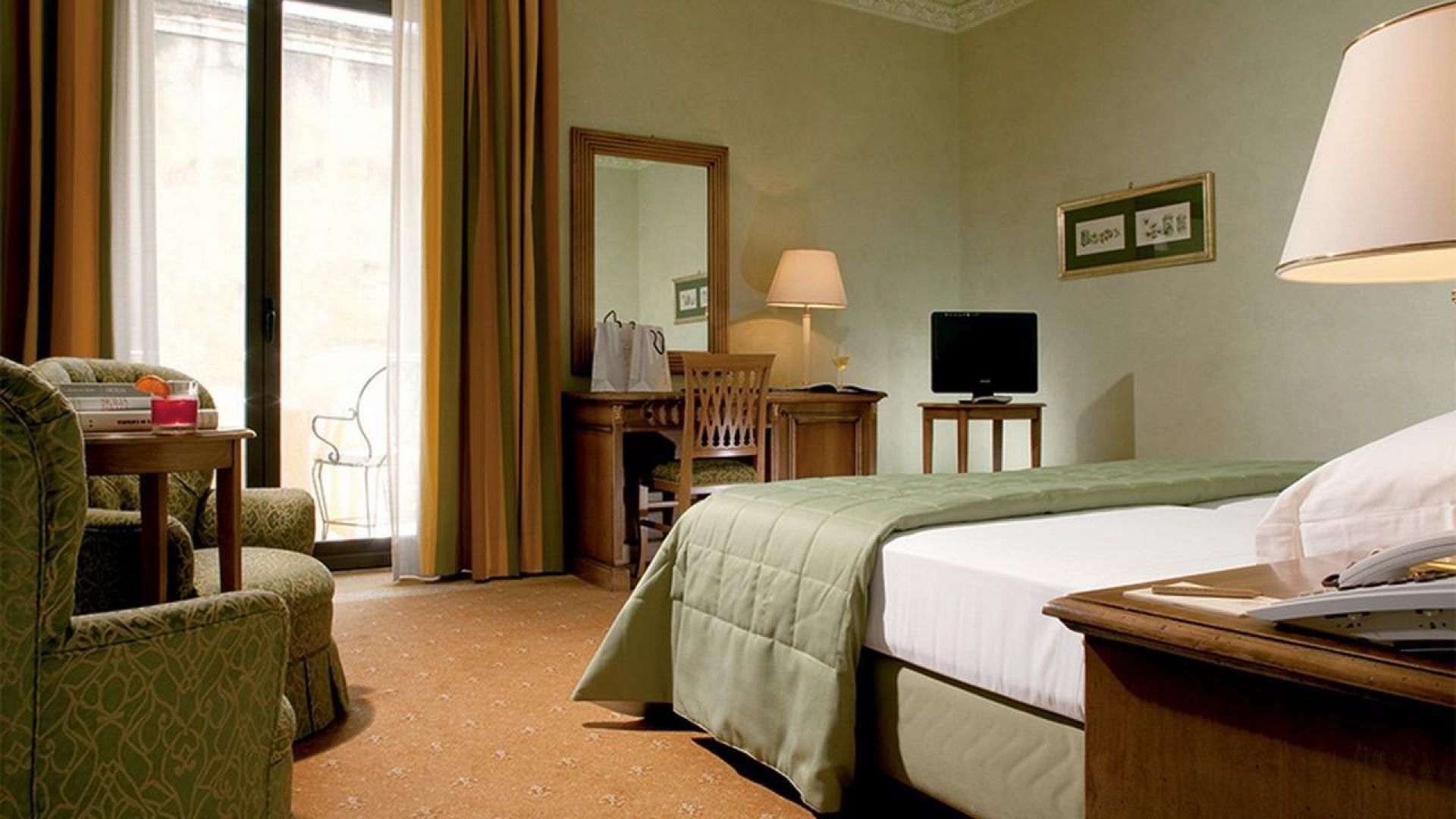 Хотелът предлага 130 стаи в класически стил с безплатен Wi-Fi, сателитна телевизия и безплатни безалкохолни напитки от минибара. Предлага се платен паркинг. Повечето стаи са с изглед към главния двор, а някои имат балкон с изглед към улицата.