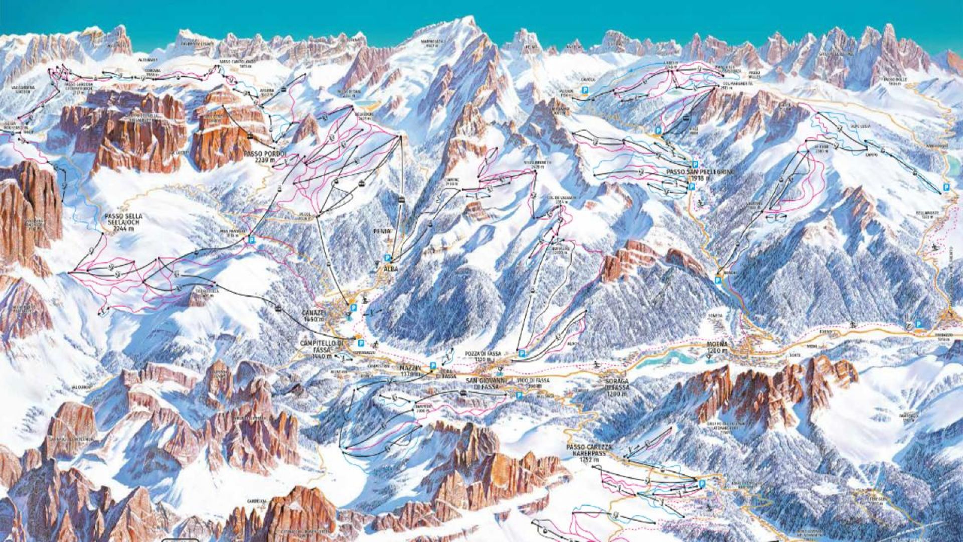 Короната в тази снежна империя е легендарната Sella Ronda - живописен ски маршрут, който обикаля величествения масив Села. Само с един ски пас получавате достъп до 12 от най-престижните ски курорти в региона, включително Cortina d’Ampezzo, Alta Badia, Val Gardena, Val di Fassa, Arabba/Marmolada и още.