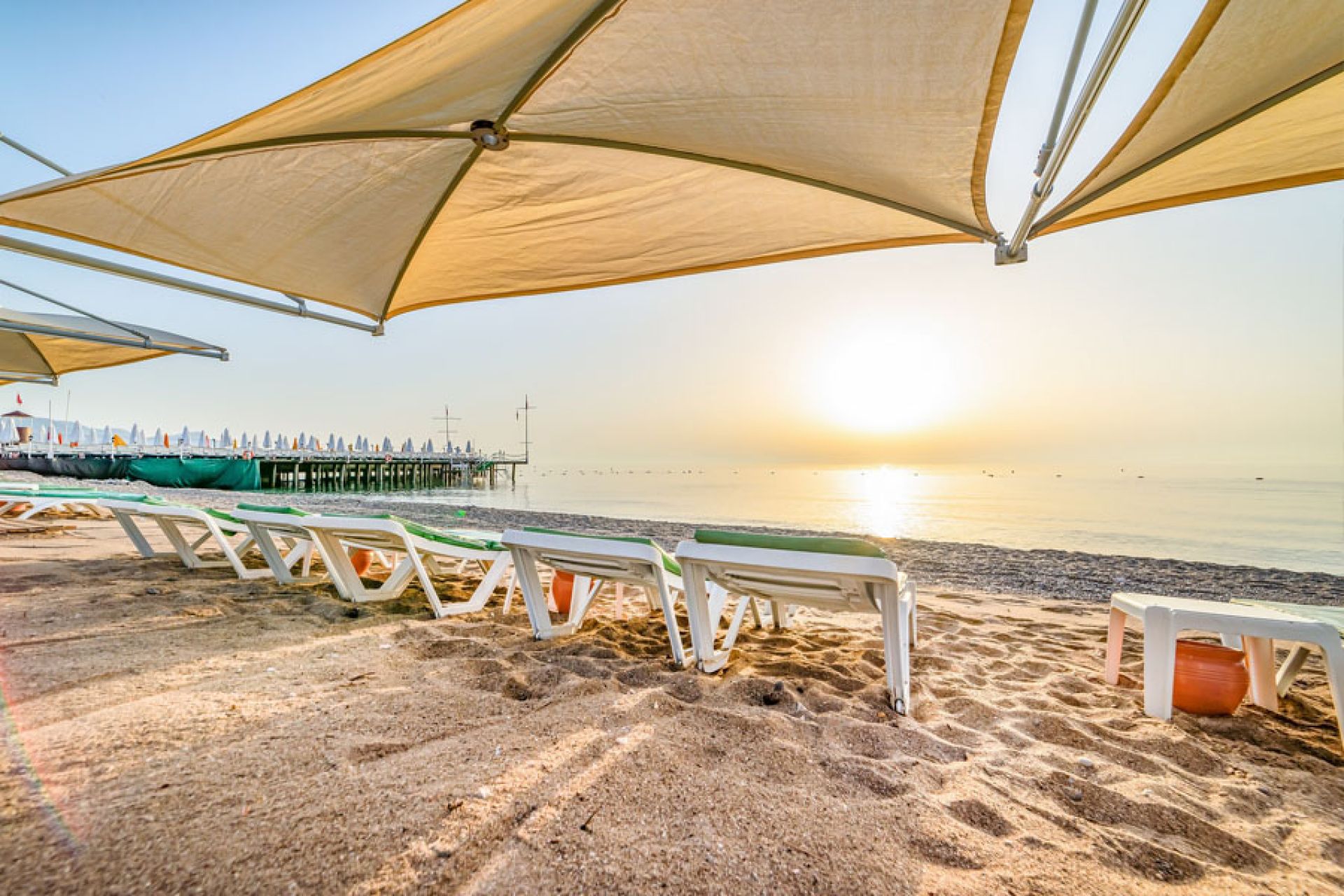 Собствен, пясъчно – чакълест. Чадъри, кърпи, шезлонги и матраци на басейна и на плажа – безплатно.