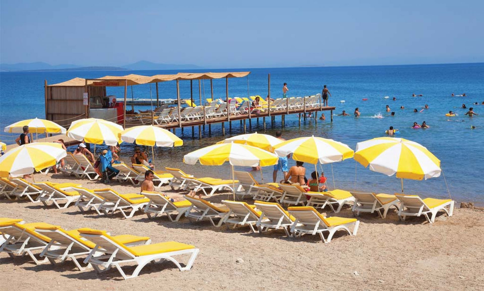Собствен, пясъчен на 400 м от хотела. Чадъри, шезлонги и плажни кърпи на плажа и при басейна – безплатно. Два пъти дневно функционира безплатен шатъл от и до плажа.