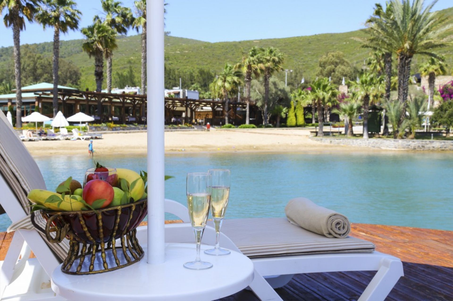 Собствен, пясъчно-чакълест със син флаг. Чадъри, шезлонги, матраци на плажа и при басейна – безплатно. Плажни кърпи - срещу депозит.