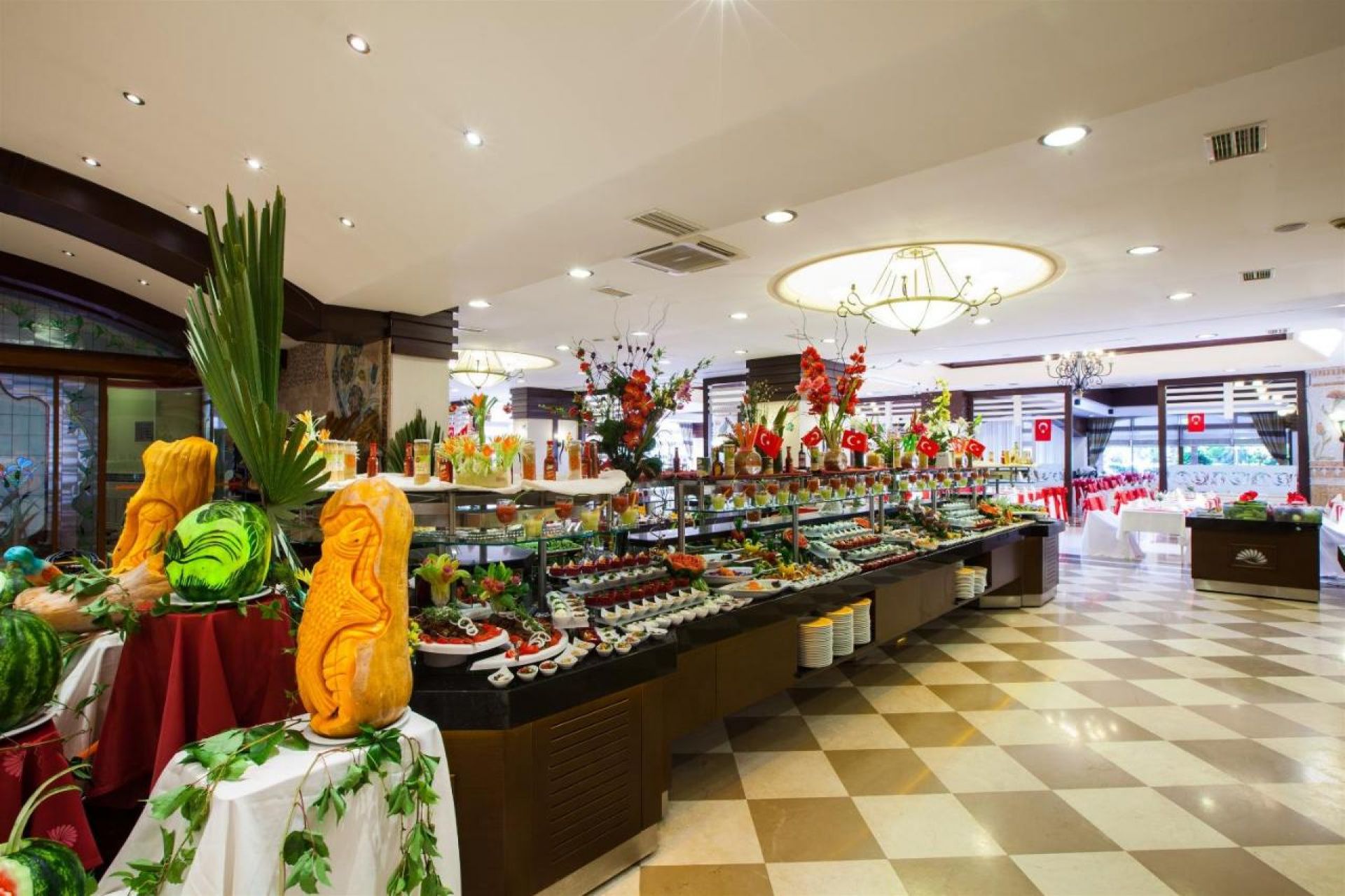 Основен ресторант, 4 а-ла-карт ресторанта (турски, италиански, китайски, рибен – 1 безплатно посещение на 1 от ресторантите при минимум 7 нощувки, с предварителна резервация), сладкарница, 5 бара, дискотека, 3 открити и 1 закрит басейн, аквапарк с 3 водни пързалки за възрастни и 3 за деца, СПА център, магазини, 2 конферентни зали.