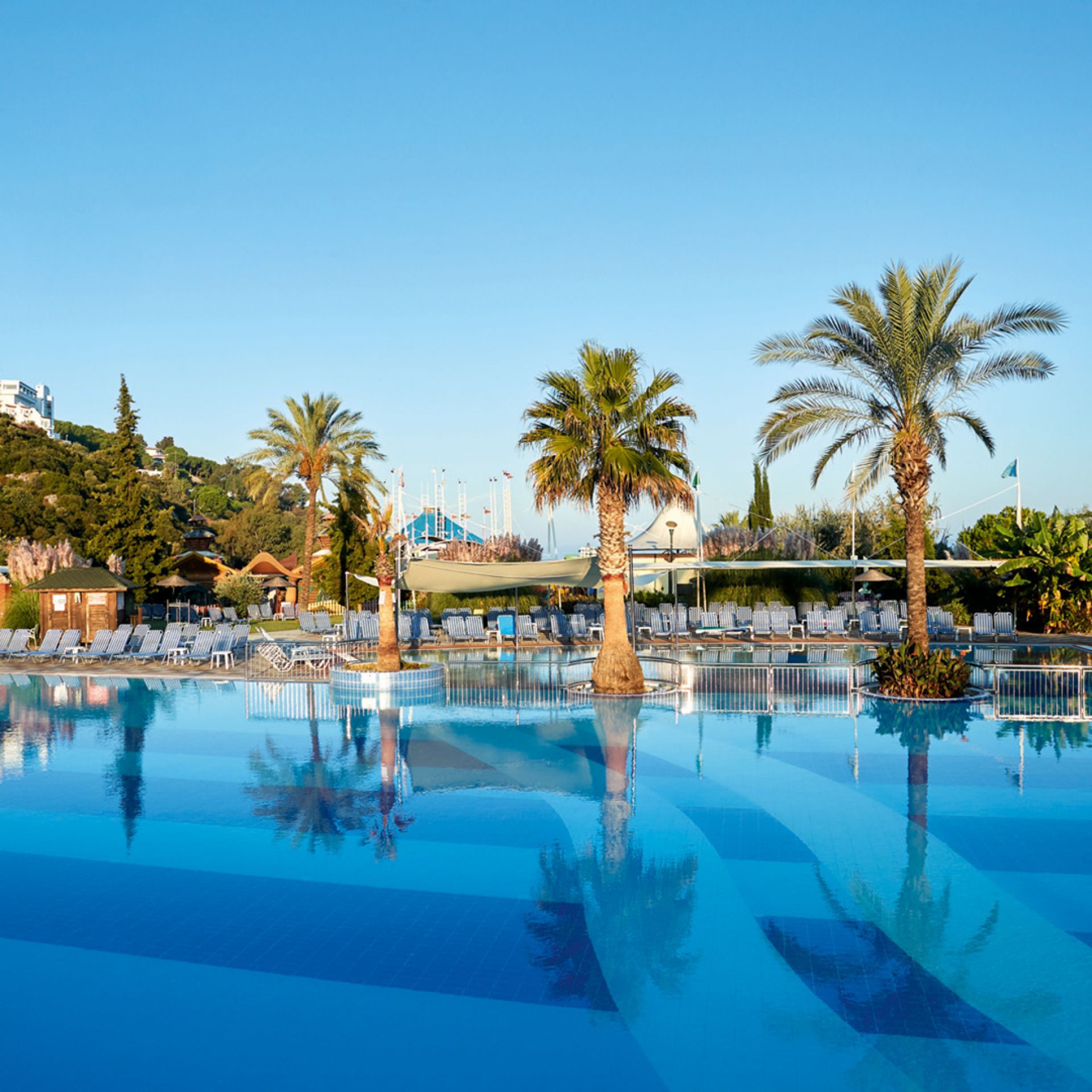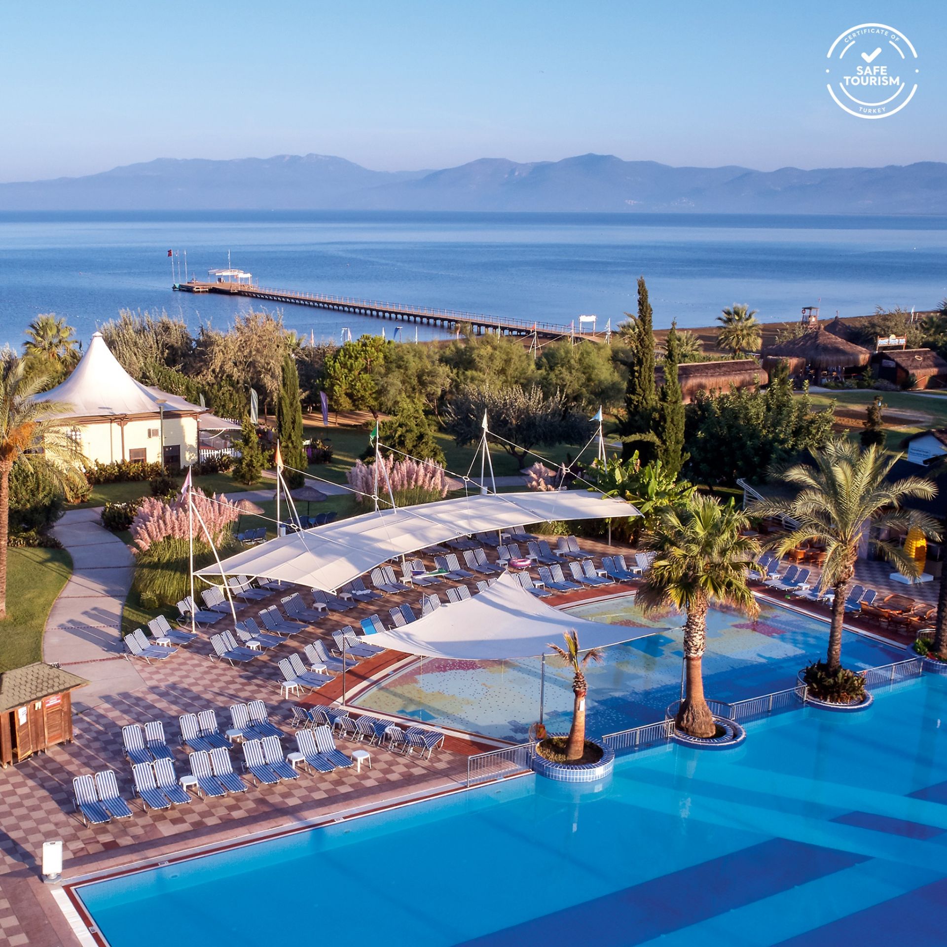 Намира се на 70 км от Измир, на 130 км от летище Милас, на 8 км от центъра на Кушадасъ, на брега на морето. Построен през 2006 г. върху обща площ от 90 000 м². Реновиран през 2019 г. Хотелът е удостоен със сертификат "Зелена звезда" за опазване на околната среда.