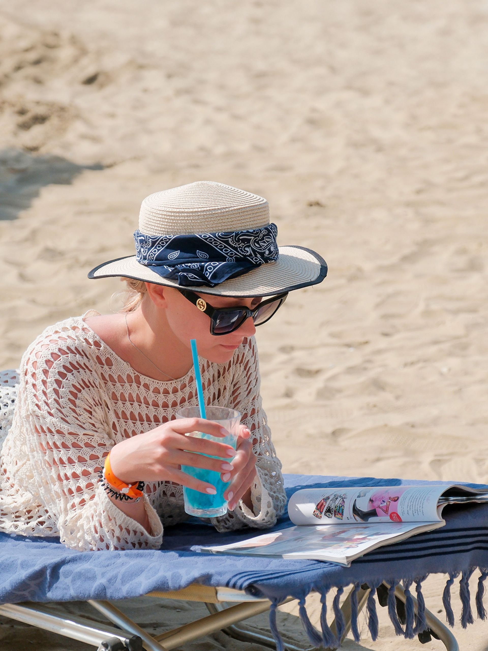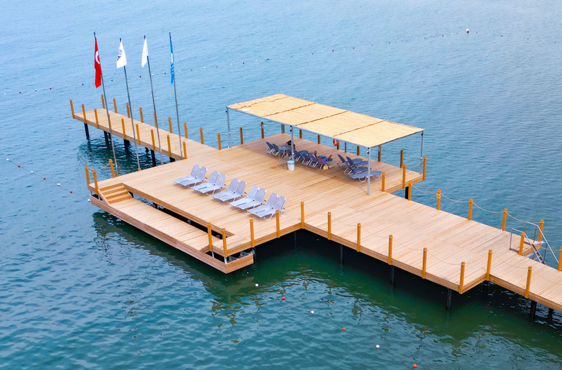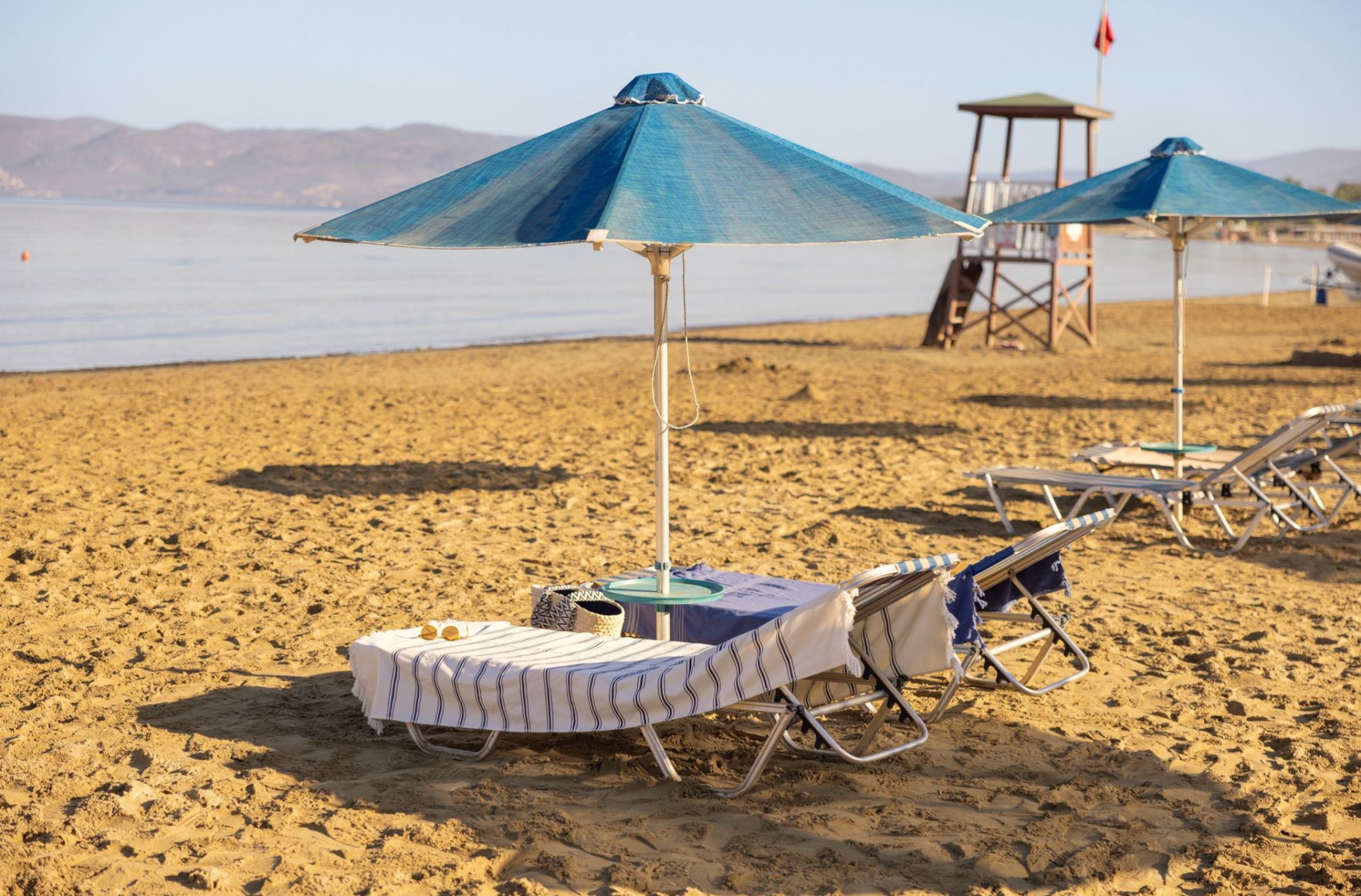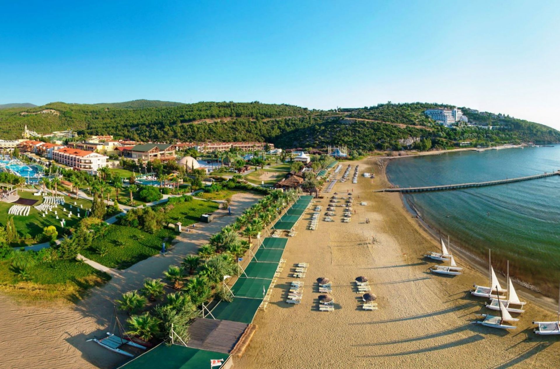 Собствен, пясъчен с дължина 300 м, притежаващ сертификат "Син флаг" и кей със 150 м дължина. Чадъри, шезлонги, матраци и плажни кърпи на плажа и при басейна - безплатно.