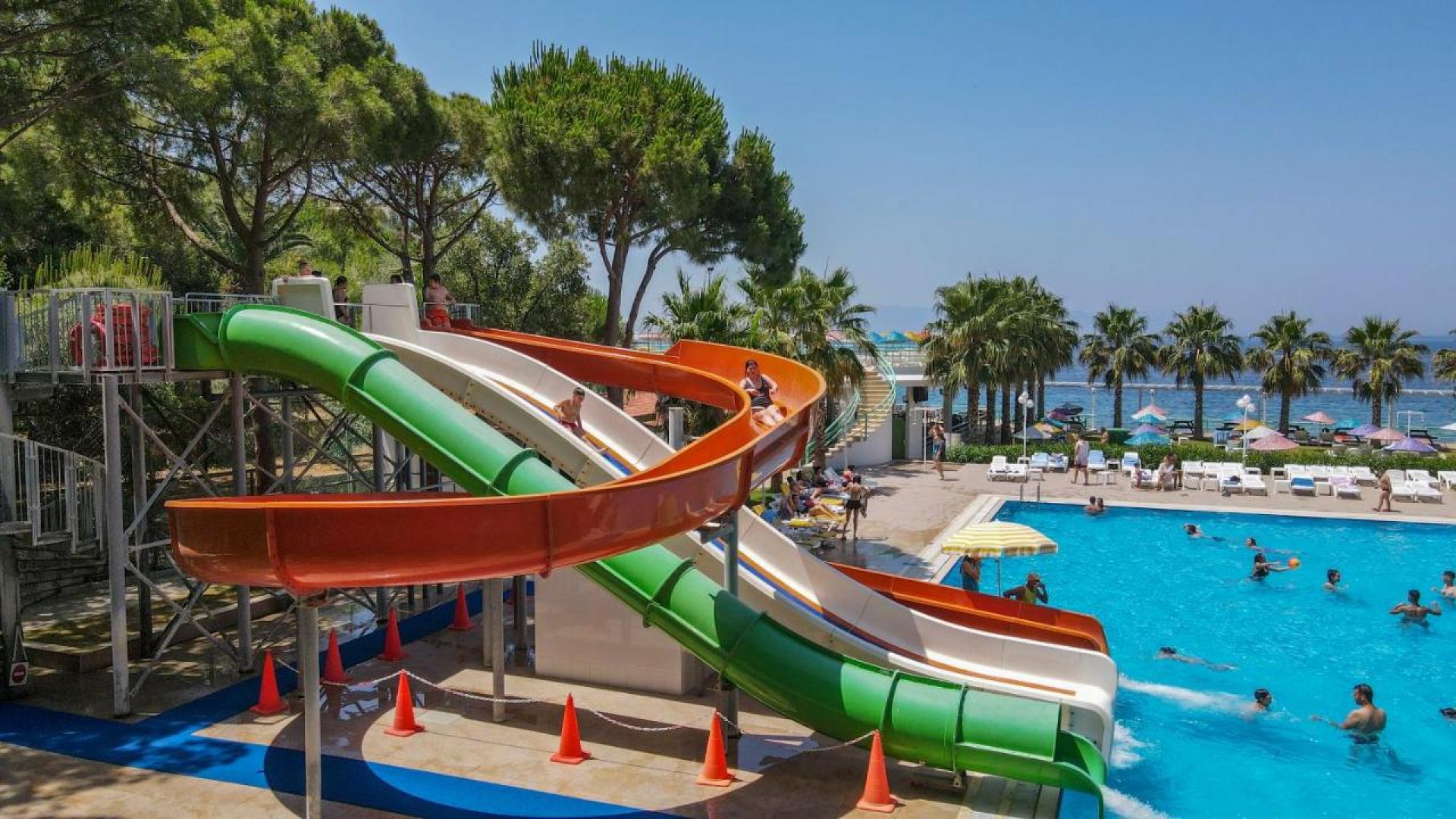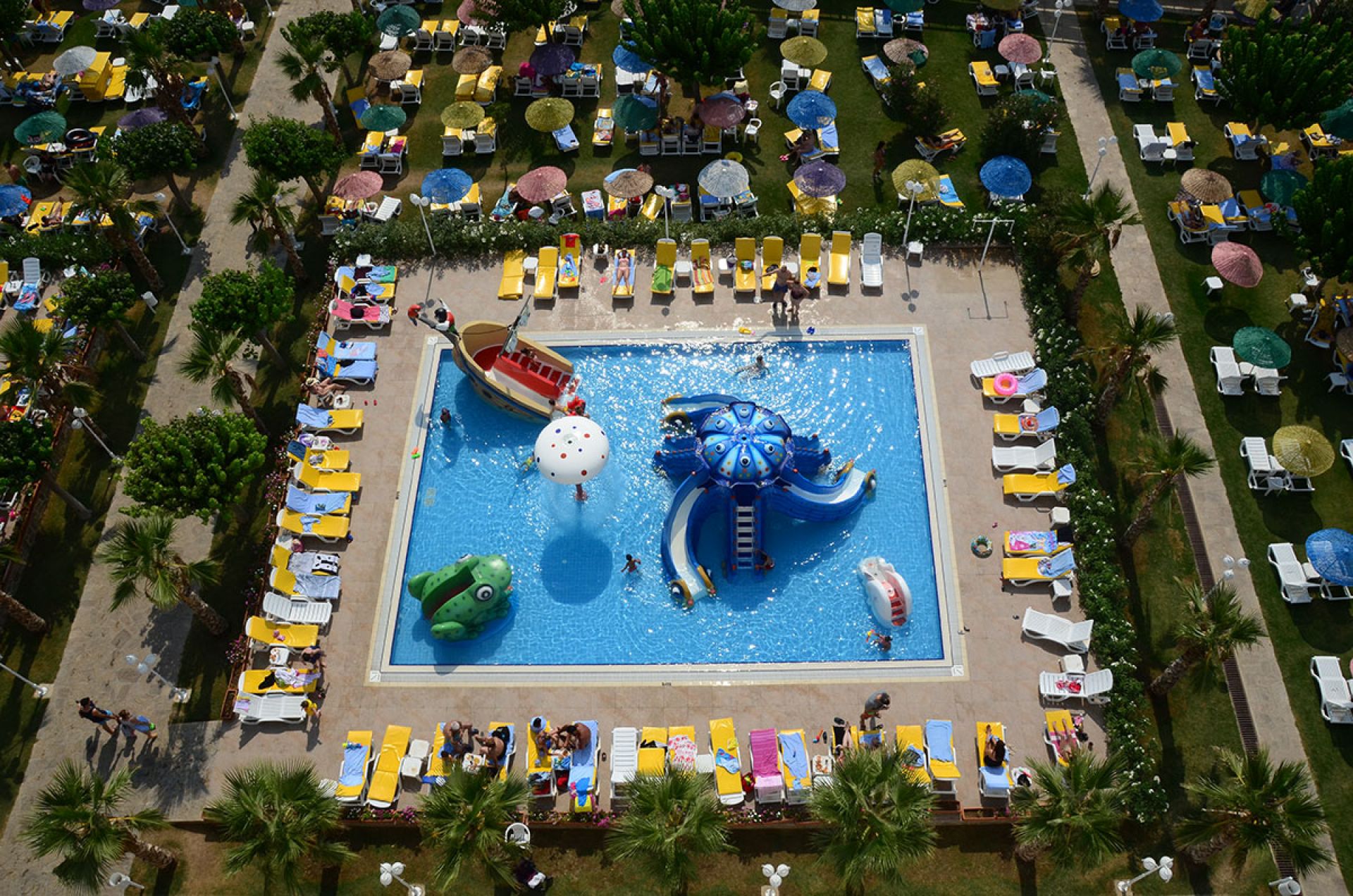 За децата: детски басейн, детски водни пързалки, мини клуб (4-12 г.), детска площадка, анимация.