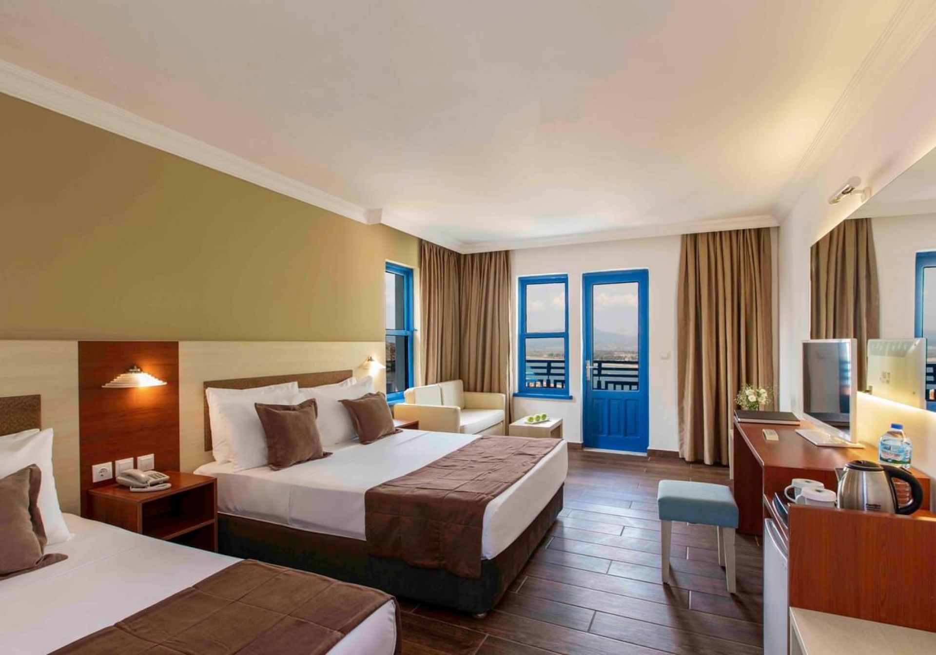 Всички стаи са оборудвани с климатик, телевизор, телефон, баня с душ, сешоар, сет за чай/кафе, минибар (безплатен), сейф (безплатен), балкон или тераса. Почистване на стаите – всеки ден, смяна на бельото и кърпите – 2 пъти в седмицата.