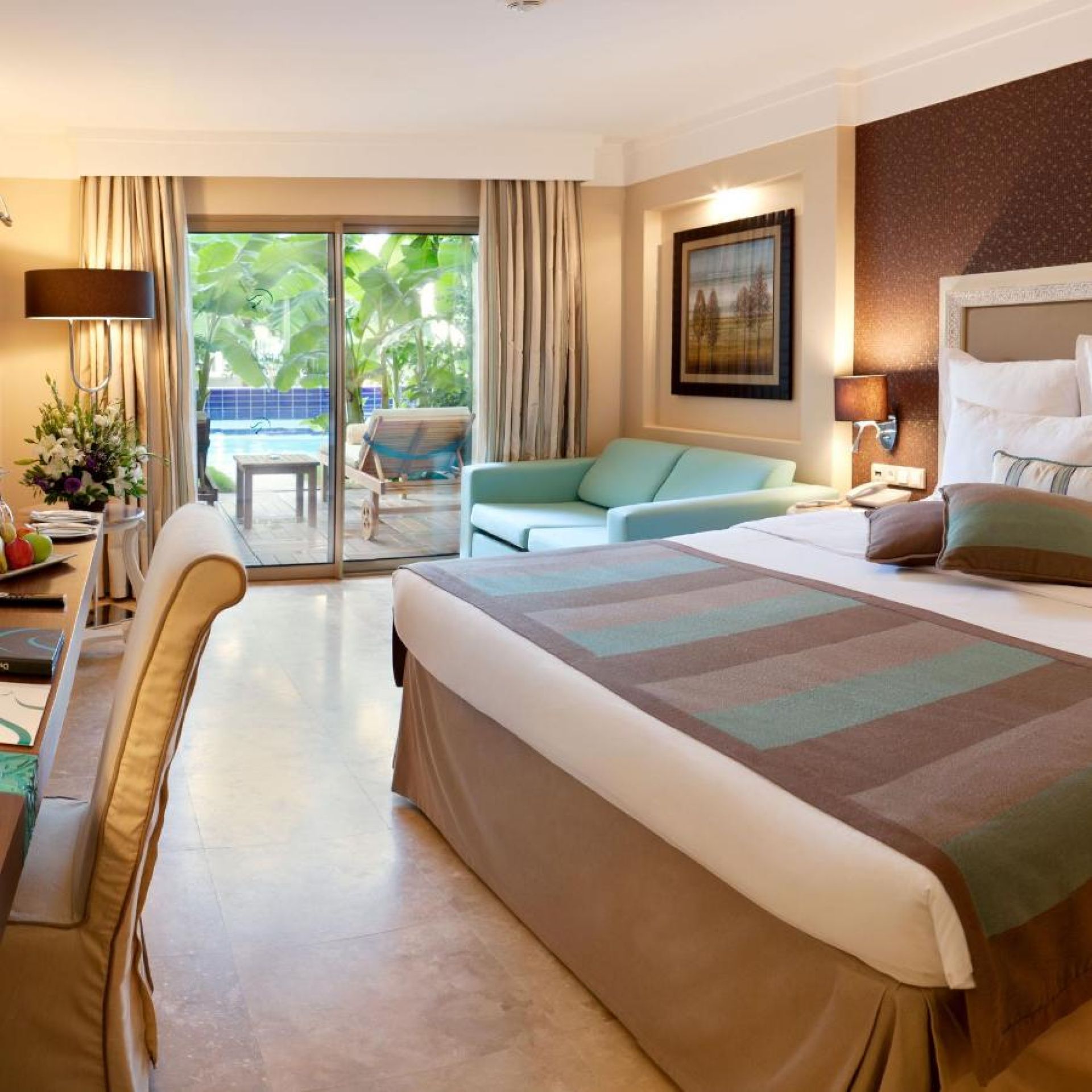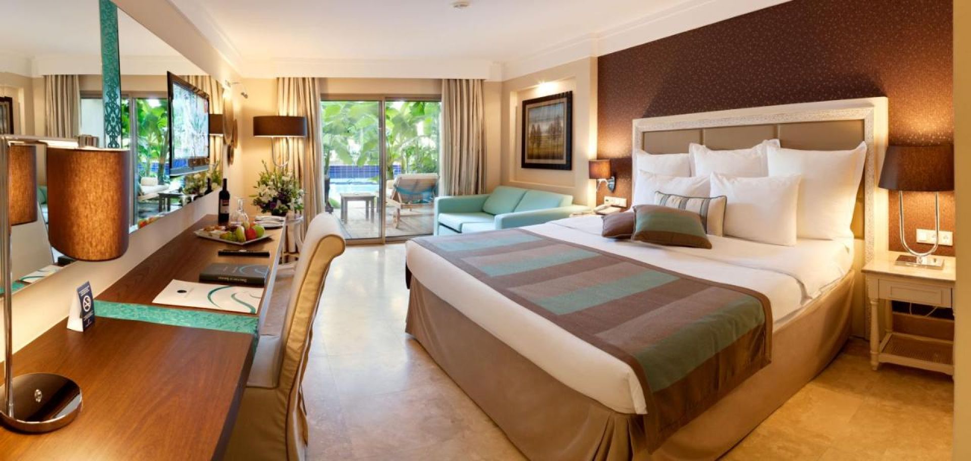 Хотелът разполага с общо 268 стаи, разпределени в два 5-етажни корпуса: 88 Standard garden view (33 кв.м), 104 Standard sea view (33 кв.м), 36 Standard Pool Side (директен достъп до басейна, с индивидуална тераса с шезлонги - 33 кв.м), 20 Terrace Suite стаи (директен изглед към море, джакузи на терасата, безплатен рум сървис 24/7, комплимент при настаняване - 70 кв.м), 20 Family Suites (гледка градина, спалня и всекидневма с преградна врата, баня с душ и вана - 65 кв.м), 2 Handicapped (пригодени за хора с ограничена подвижност - 33 м2). Всички стаи са оборудвани с климатик, телевизор, телефон, баня с душ, сешоар, сет за чай/кафе, минибар (ежедневно зареждане с вода и безалкохолни напитки - безплатно), сейф (безплатно), балкон.