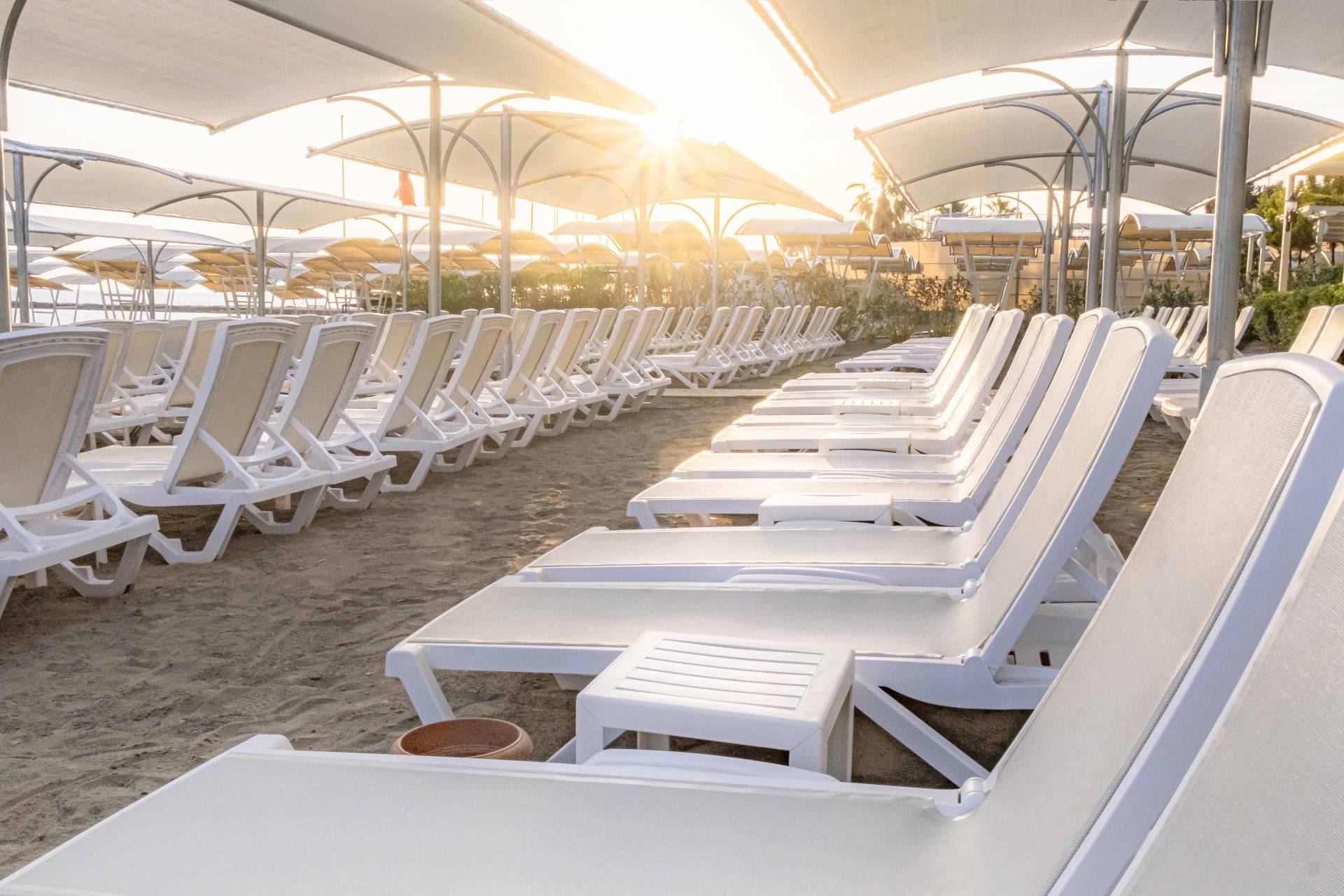 Собствен, пясъчно - чакълест. До плажа се стига посредством подземен тунел. Чадъри, шезлонги и плажни кърпи на плажа и при басейна – безплатно.