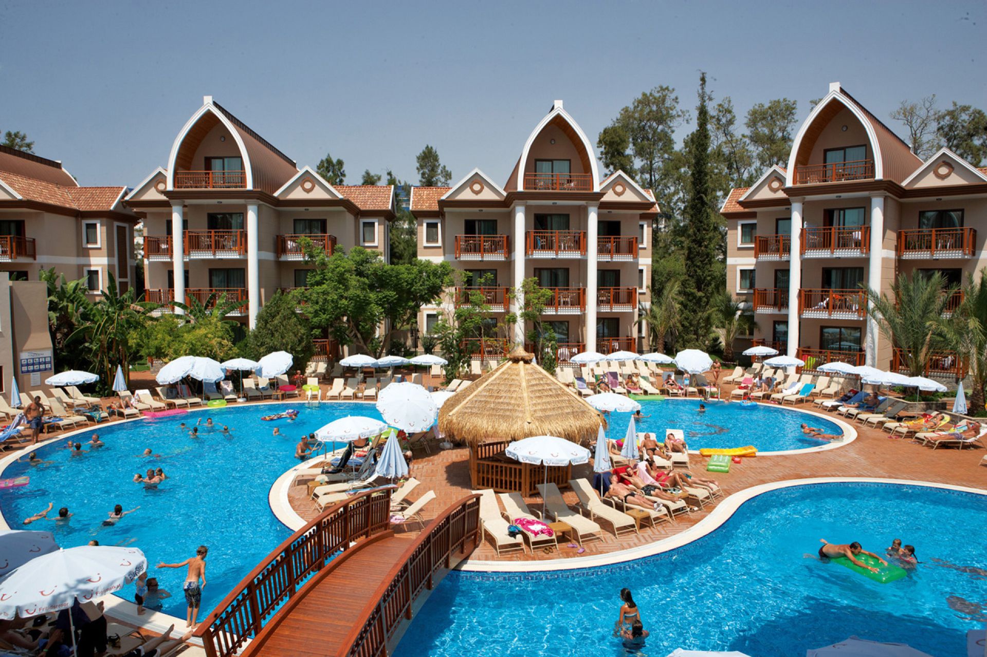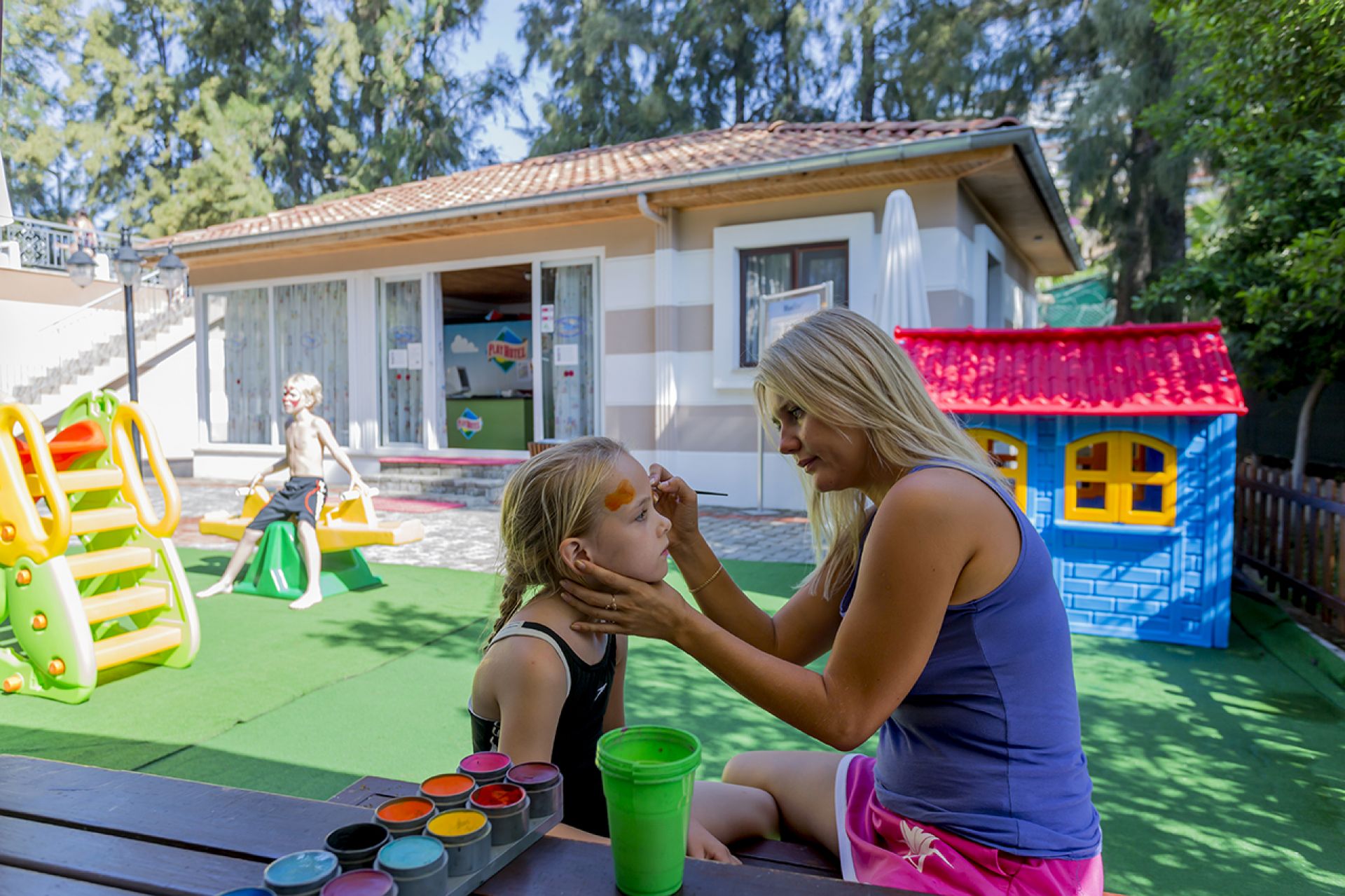 За децата: Детско меню, 2 детски басейна, 3 водни пързалки за деца, детска площадка, мини клуб (4-12 г), мини диско, детска анимация, детско столче, детска количка (под наем).