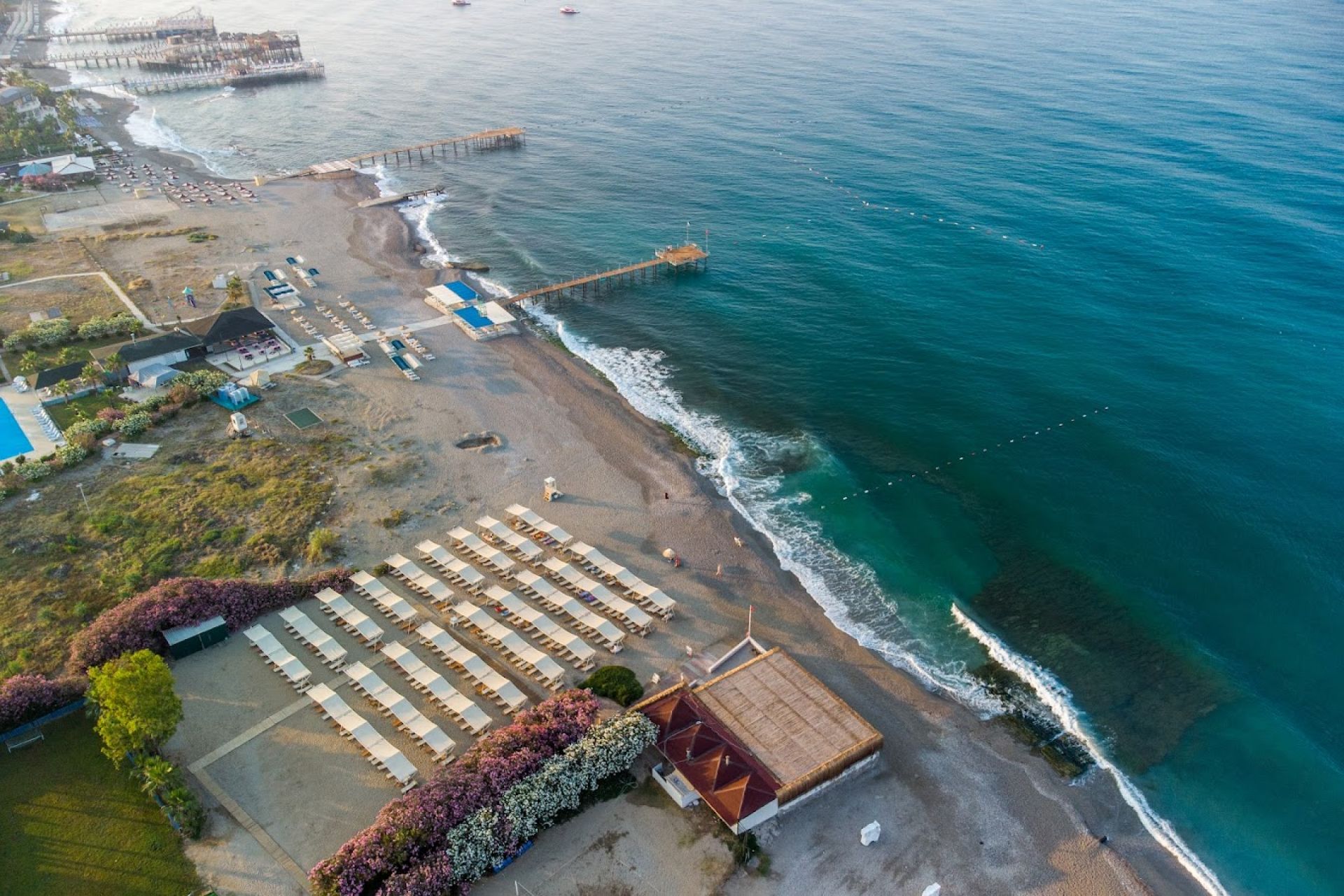 Собствен, чакълест. Чадъри и шезлонги на плажа и при басейна - безплатно.