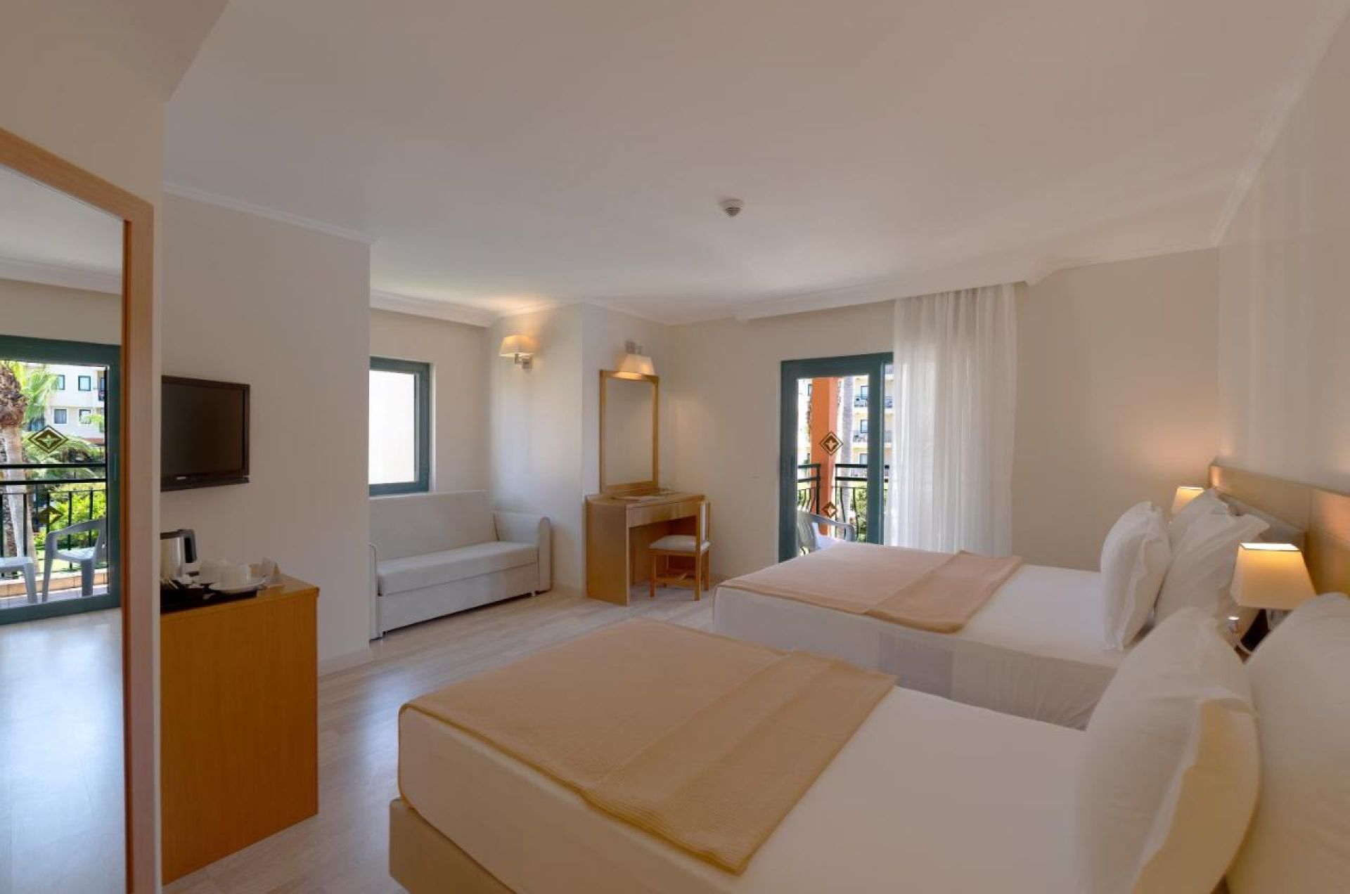 Стаи Main Building: Standard room (28 м2), Standard room Sea view (с изглед море - 28 м2), 95 Hotel Family room (2 спални, 1 баня - 43 м2), Junior Suite room (1 спалня, всекидневна, 2 бани - 45 м2), Suite Land view room (с изглед суша, 1 спалня, всекидневна, 2 бани - 40 м2), Suite Sea view (с изглед море, 1 спалня, всекидневна, 1 баня - 50 м2), Suite with Sauna & Jacuzzi* (1 спалня, 2 бани, джакузи – 75 м2), King Suite* (2 спални, всекидневна, 1 баня – 75 м2), Handicapped room (пригодени за хора с ограничена подвижност - 28 м2).