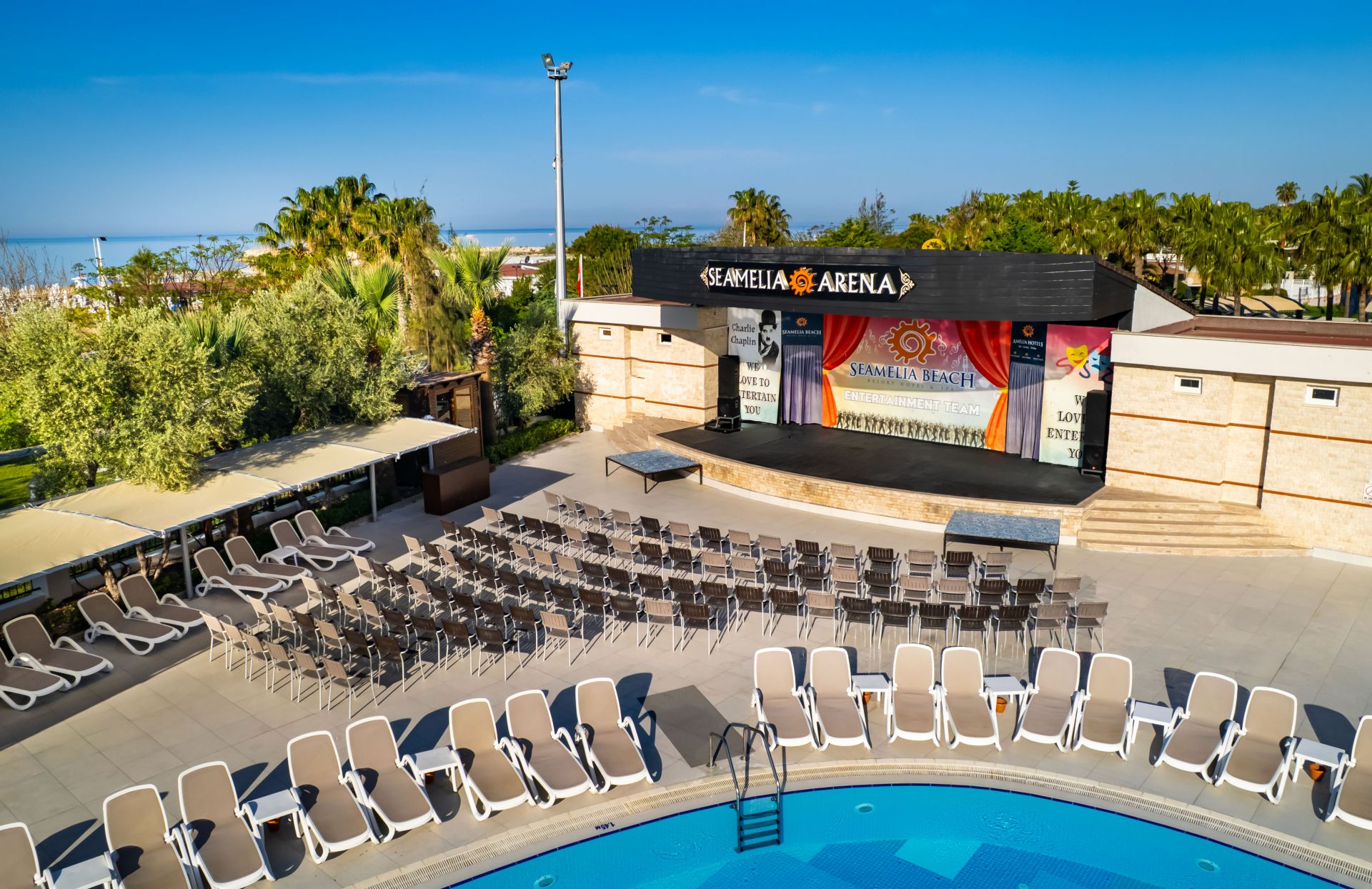 Основен ресторант, 4 а - ла - карт ресторанта (рибен, турски, италиански и китайски, с предварителна резервация, за едноседмичен престой - едно безплатно посещение на един ресторант), сладкарница, 6 бара, 2 открити и 1 закрит басейн, водни пързалки, амфитеатър, дискотека, мини маркет, 4 конферентни зали. За децата: 2 детски басейна – открит и закрит, мини клуб (4-12 г.), тийни клуб (11-15г.) – 6 дни в седмицата, детска анимация, лунапарк. Безплатни услуги: Сауна, турска баня, аеробика, дартс, тенис на маса, степ, боча, плажен волейбол, анимация, Wi-Fi (в лоби). Платени услуги: Масаж, Спа център, лекар, фризьор, рент-а-кар, химическо чистене, боулинг, билярд, интернет, електронни игри, водни спортове, фрешове на плажа. Плаж: Собствен - пясъчен, удостоен със сертификат „Син флаг”. Чадъри, шезлмонги, матраци и плажни кърпи на плажа и при басейните - безплатно.