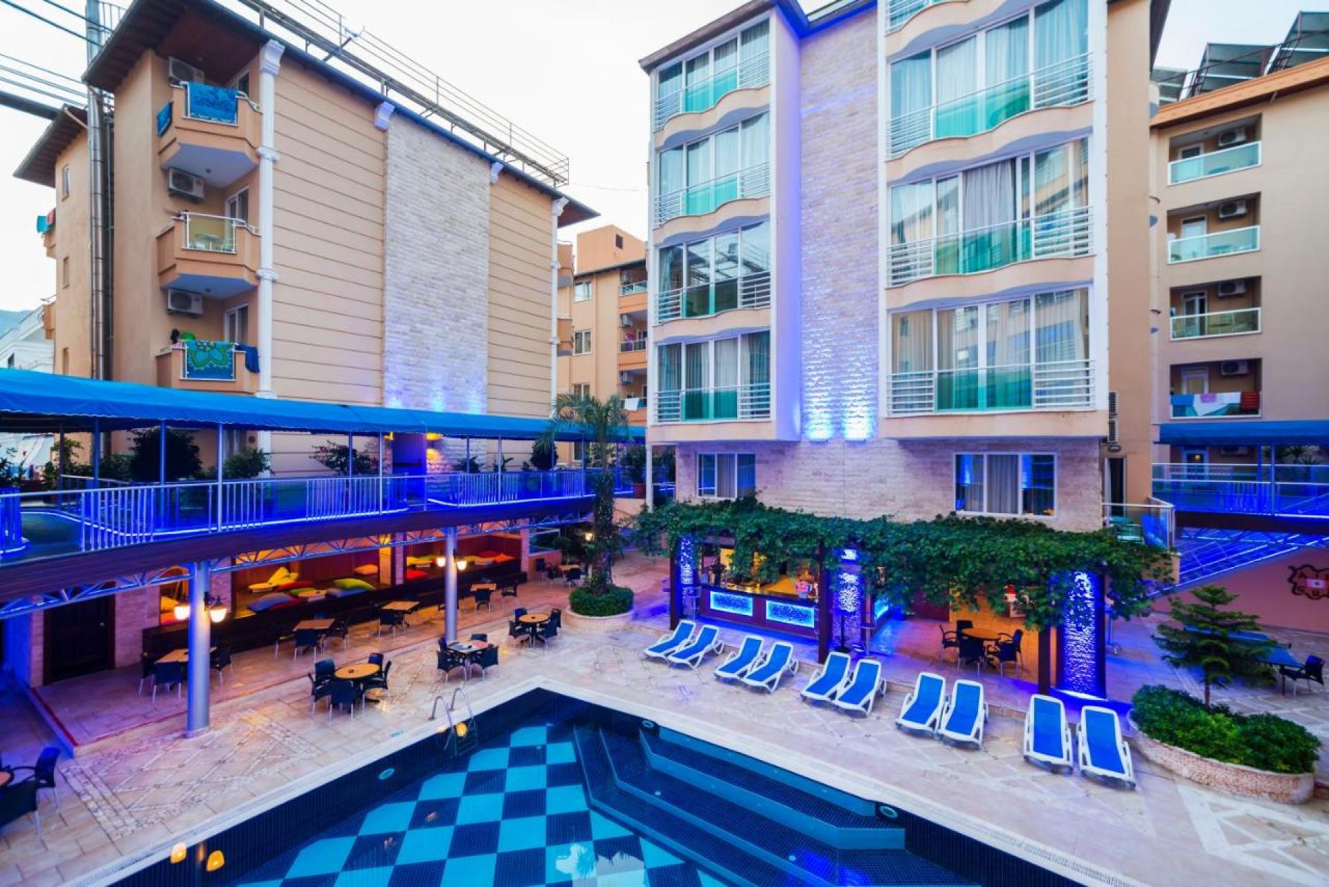 Намира се на 120 км от летище Анталия и на 40 км от летище Gazipaşa, само на 50 м от плаж Клеопатра, където притежава собствен плаж. Центърът на Алания се намира на 1 км от хотела и до него се стига лесно с общетвен транспорт или такси. Построен през 2010г върху обща площ от 7.500 m², хотелът се състои от 7 отделни сгради и разполага с общо 293 стаи. Последно реновиран през 2020г.