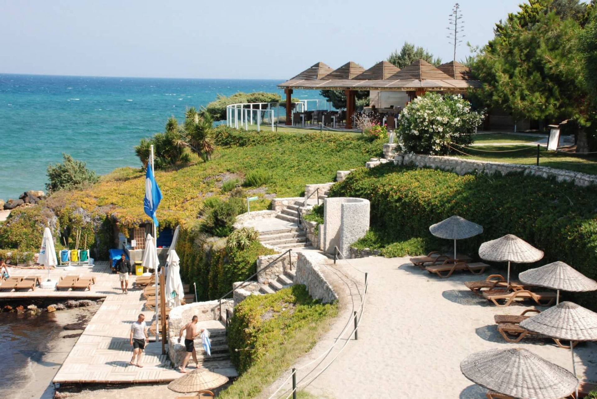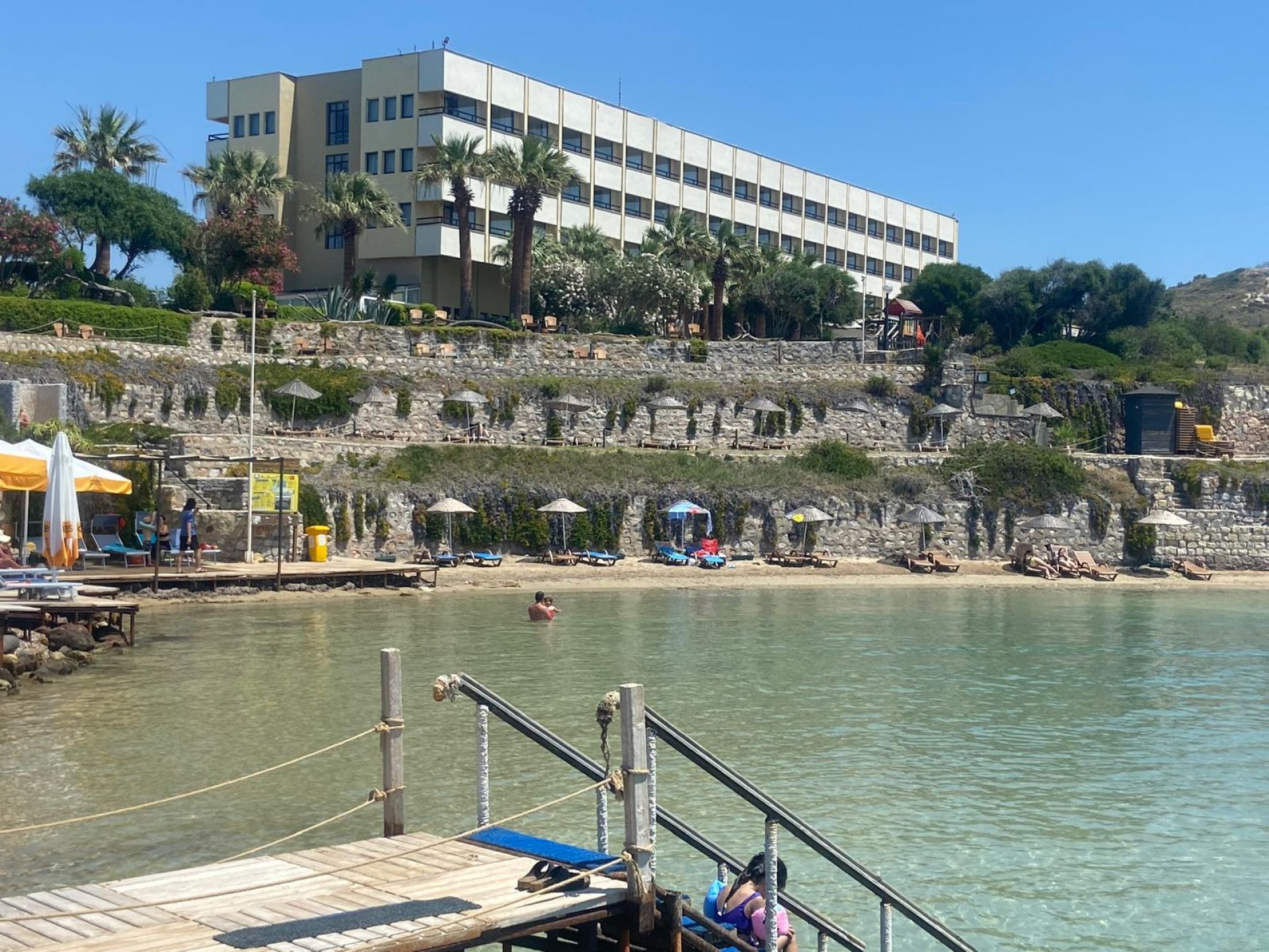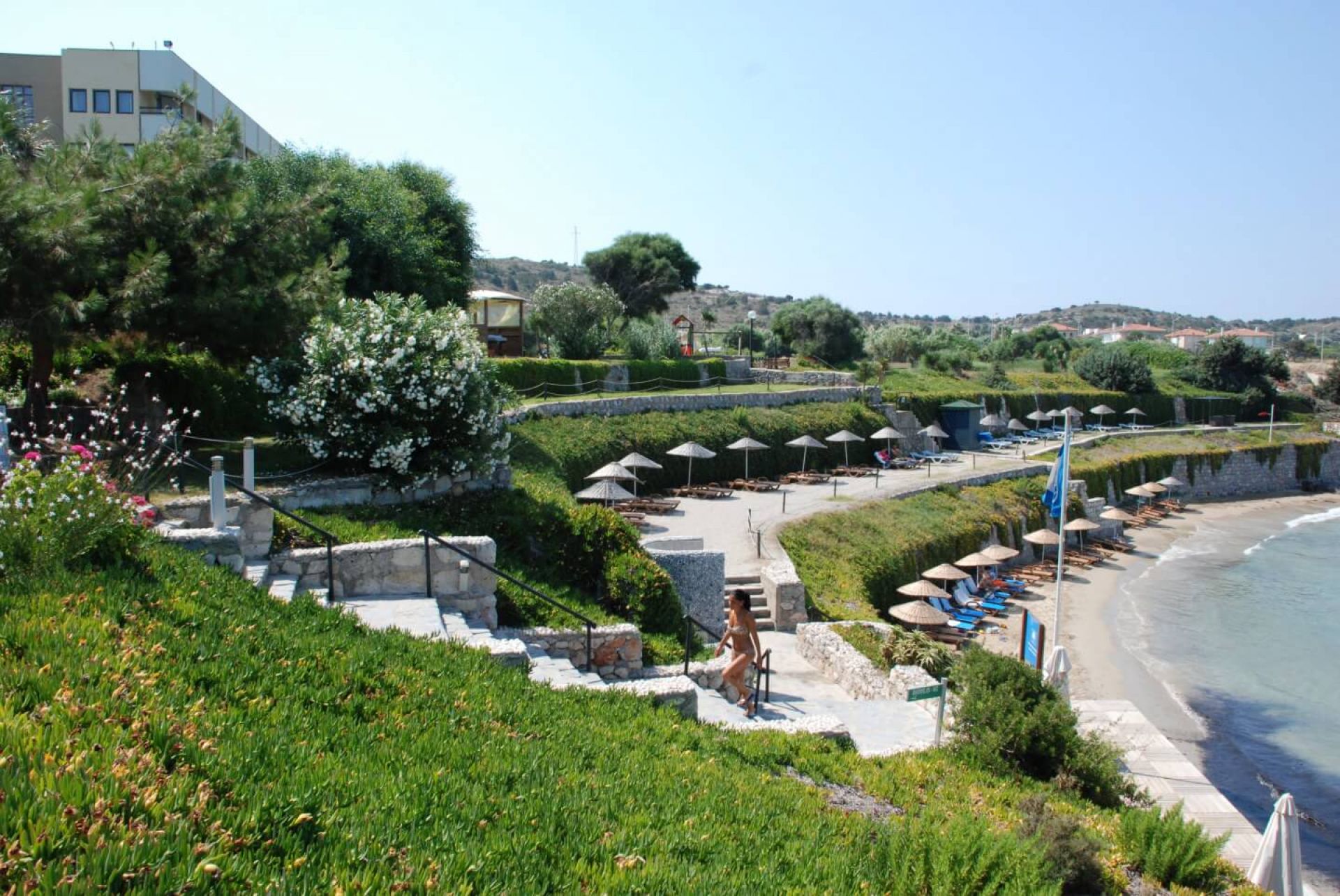 Плаж: дължина на плажната ивица 150 м. Разпределен на 3 нива – първите две нива са с фин пясък, а третото ниво е тревна площ . Морското дъно е с фин пясък плавно полегато. Плажът е удостоен със сертификат „Син флаг“. Има и платформа. Чадъри, шезлонги и матраци на плажа и при басейна- безплатно. Плажни кърпи - безплатно.