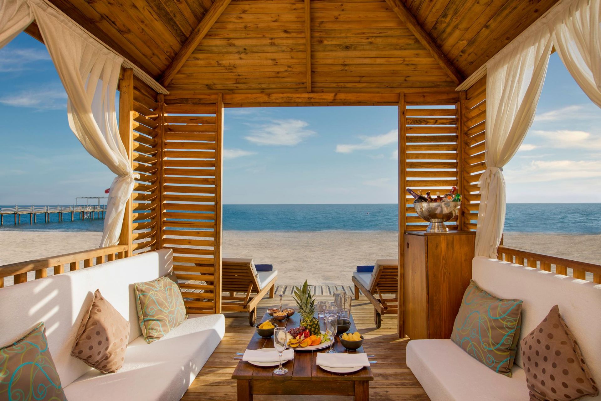 Собствен, пясъчен плаж. 650 м плажна ивица. Чадъри и шезлонги на плажа и при басейна – безплатно. Плажни кърпи – безплатно.