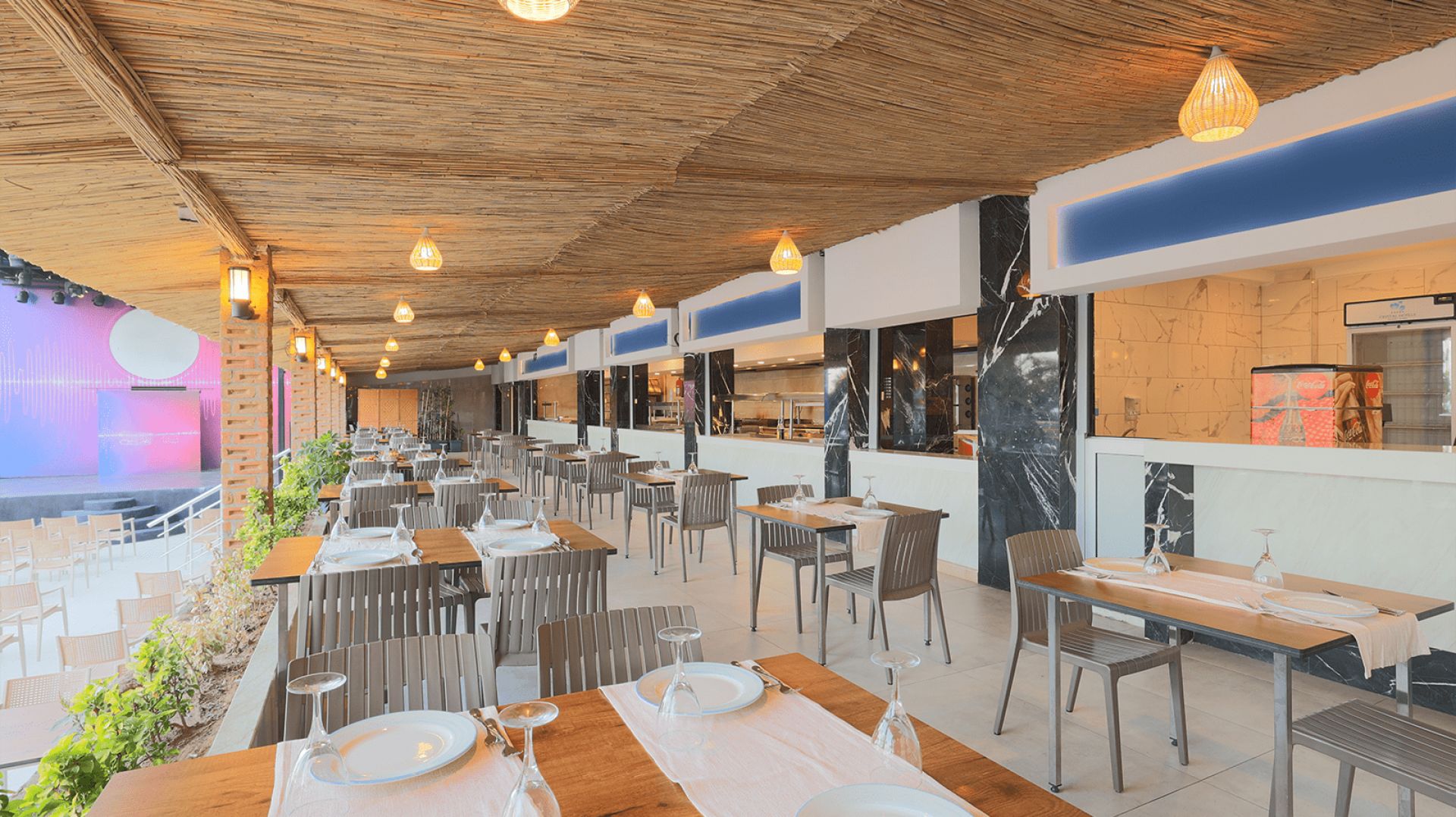 Основен ресторант, 1 а-ла-карт ресторанта (1 безплатно посещение при минимум 7 нощувки, с предварителна резервация), 1 снек ресторант, сладкарница, 3 бара, 2 открити басейна, 4 водни пързалки, СПА център, магазини, паркинг.