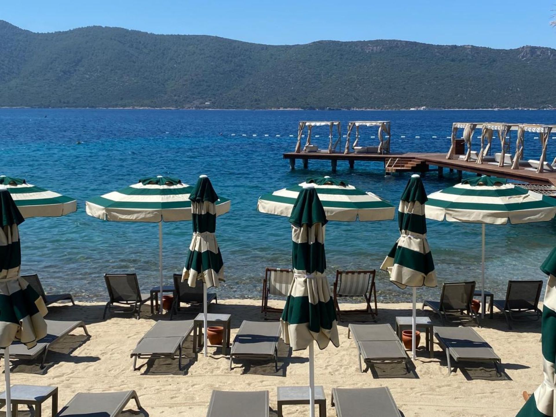 Собствен пясъчен плаж и платформа. Чадъри и шезлонги на плажа и на басейна - безплатно.